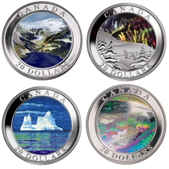 2003 $20 Rocky Mountains, 2004 Icebergs, Northern Lights & Niagara Falls - Lot of 4 Pure Silver Coins. Tax Exempt.