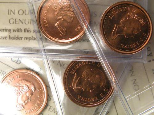 Canada Cent 2003 Diademed Portrait, 2003P Diademed Portrait, 2003 New Effigy and 2003P New Effigy, all ICCS MS-66 Red, and virtually full red