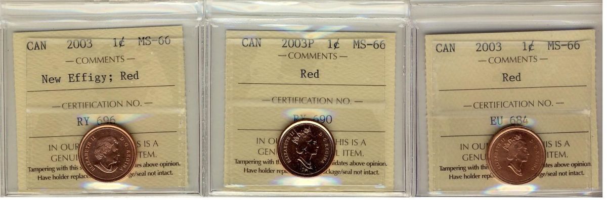 2003, 2003P,2003 New Effigy 1¢ ICCS MS66 Red, Lot of 3 coins,