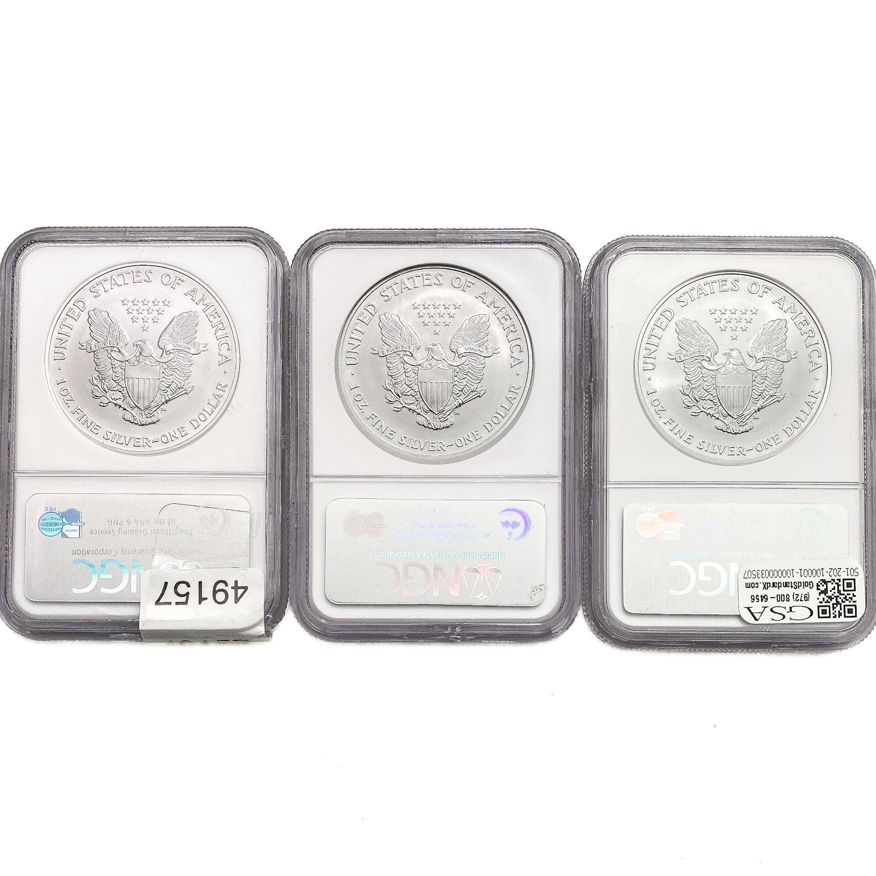 e. Coins sold referencing a third-party grading service are sold “AS IS” without any express or implied warranty, except for a guarantee by GSA that they are genuine. Removal or alteration of the holder, voids all of Bidder’s claims concerning that Product. Certain warranties may be available from the grading services and Bidders are referred to them for further details: Numismatic Guaranty Corporation (NGC), PO Box 4776, Sarasota, FL 34230, www.ngccoin.com/services/writtenguarantee.asp; Professional Coin Grading Services (PCGS), PO Box 9458, Newport Beach, CA 92658, www.pcgs.com/guarantee.html; ANACS, 6555 S. Kenton St., Ste. 303, Englewood, CO 80111; and Independent Coin Grading Co. (ICG), 7901 East Bellview, Ave., Suite 50, Englewood, CO 80111.