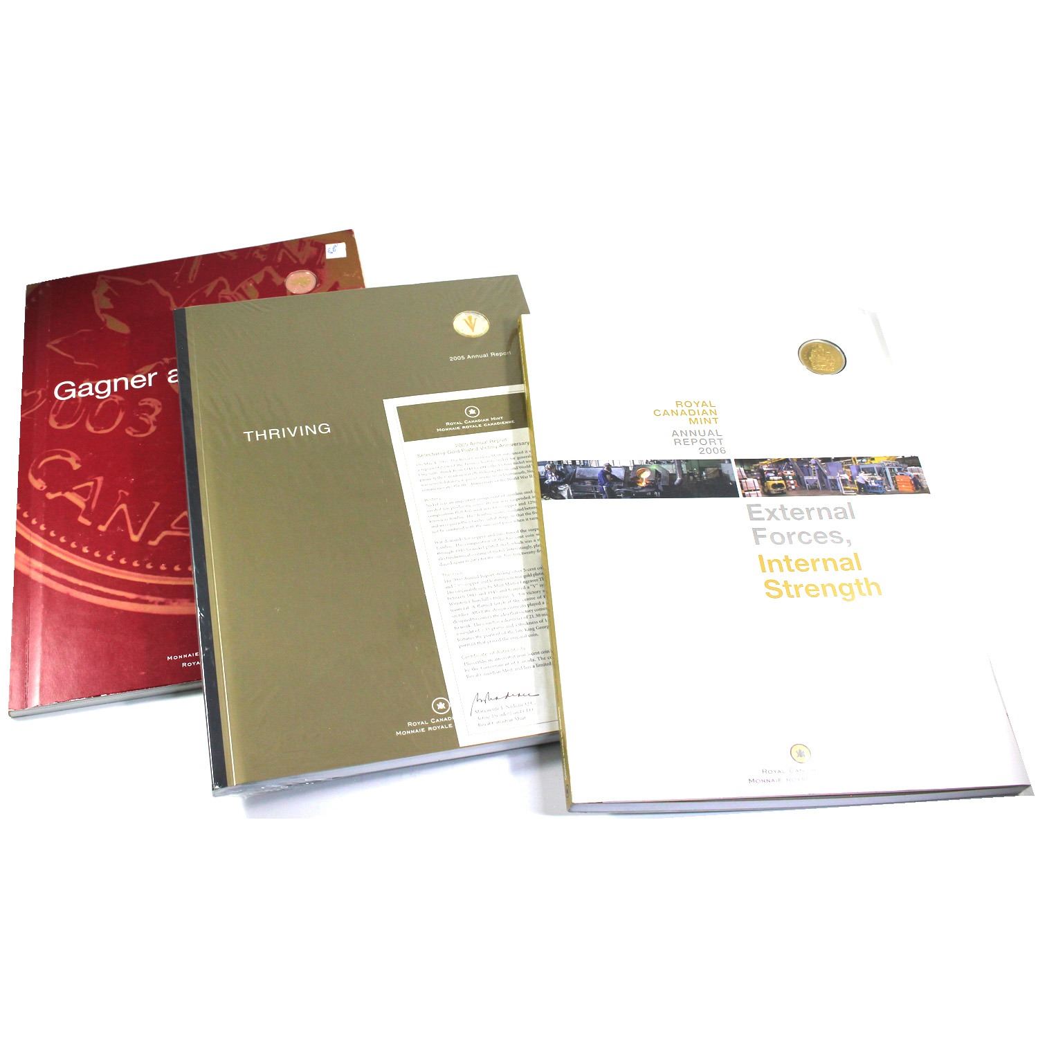2003-2006 Canada RCM Annual Report Collection. You will receive the 2003 Report with Gold Plated 1-cent, 2005 Report with Silver VE-Day 5-cent and 2006 Canada RCM Annual Report with Gold Plated 50-cent. 3pcs