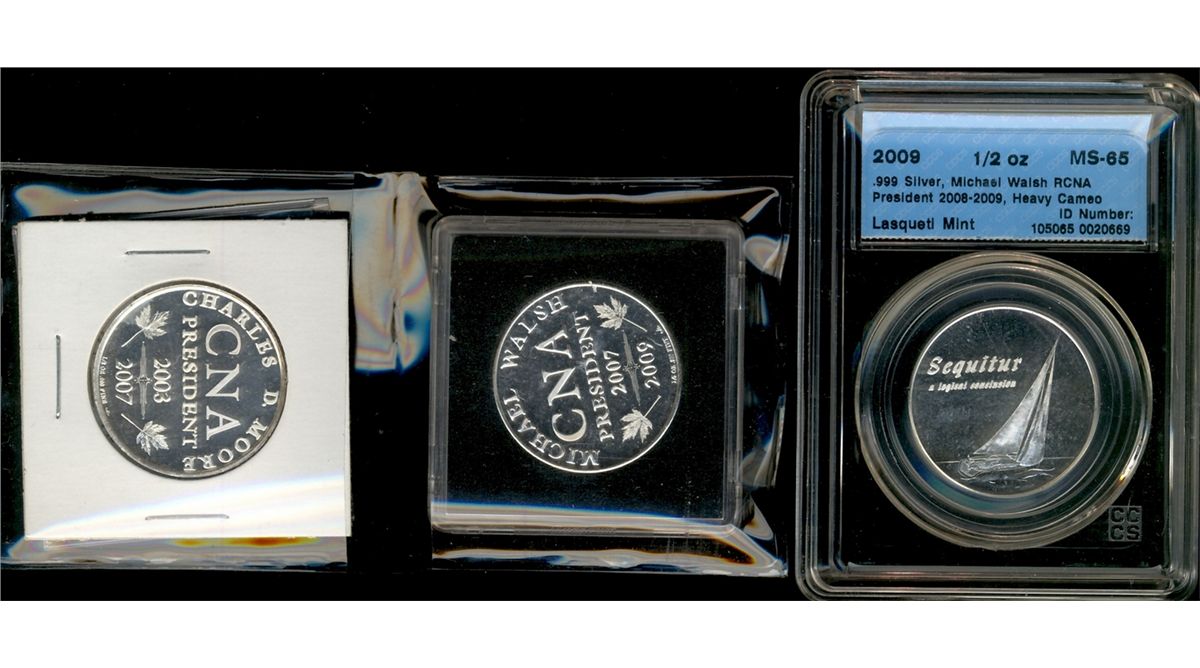 2003/2007 Charles D Moore & Michael Walsh ½oz Silver Medallion, representing CNA President along with a 3rd 2008/2009 Michael Walsh issue graded CCCS MS65 with Hvy Cameo. Nice lot of 3 limited edition pcs.