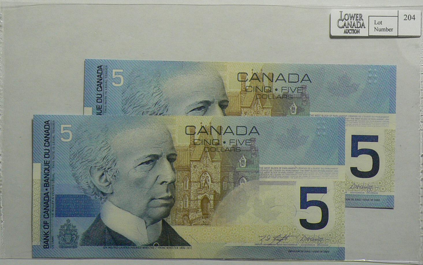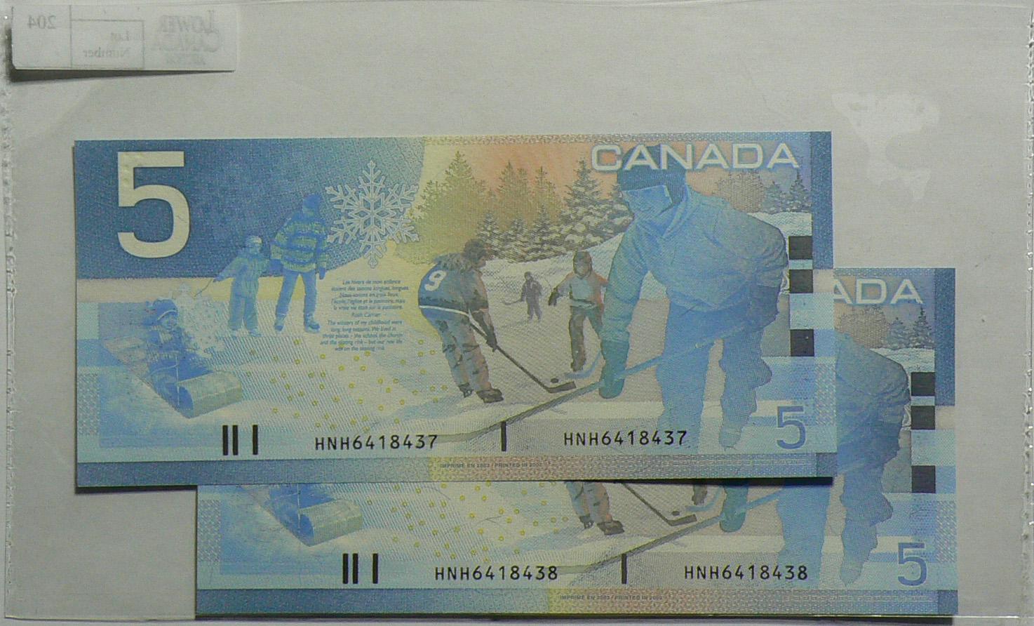 2003 Five Dollars 2 Consecutive Replacement, BC-62aA-i, GEM UNC, Knight Dodge, serial HNH6418437-38, insert range 6.400M - 6.580M.