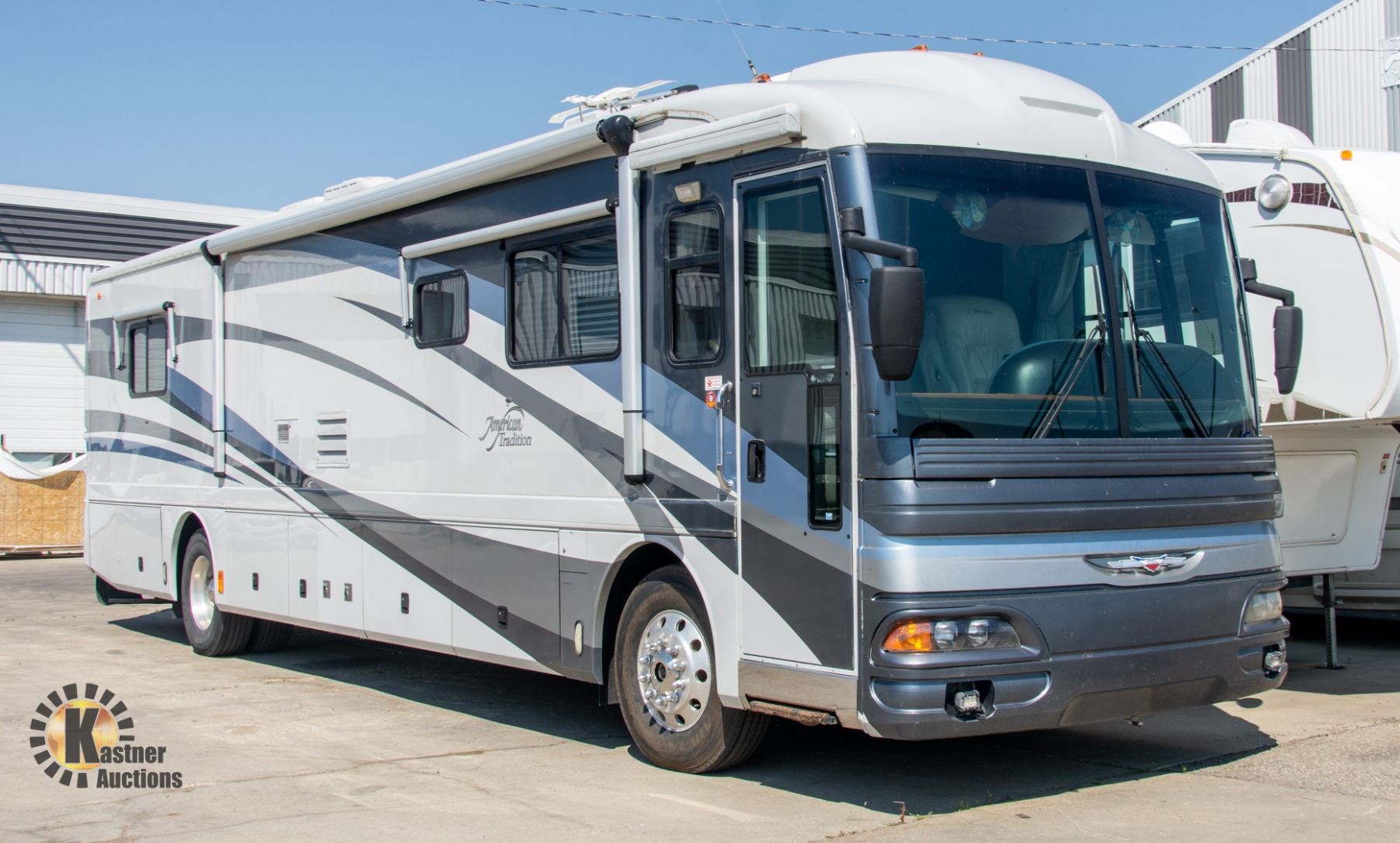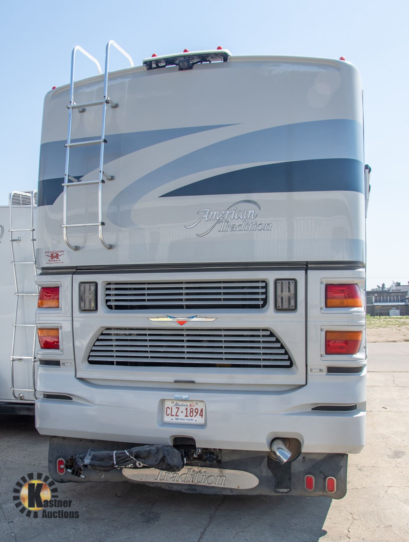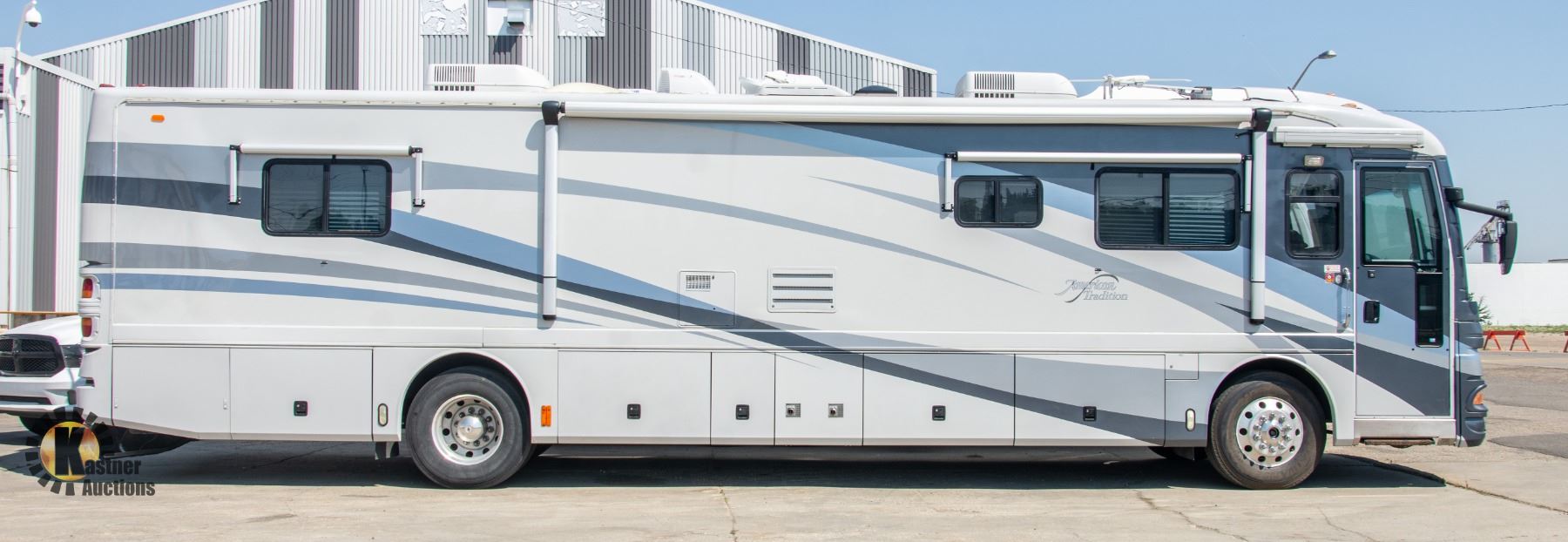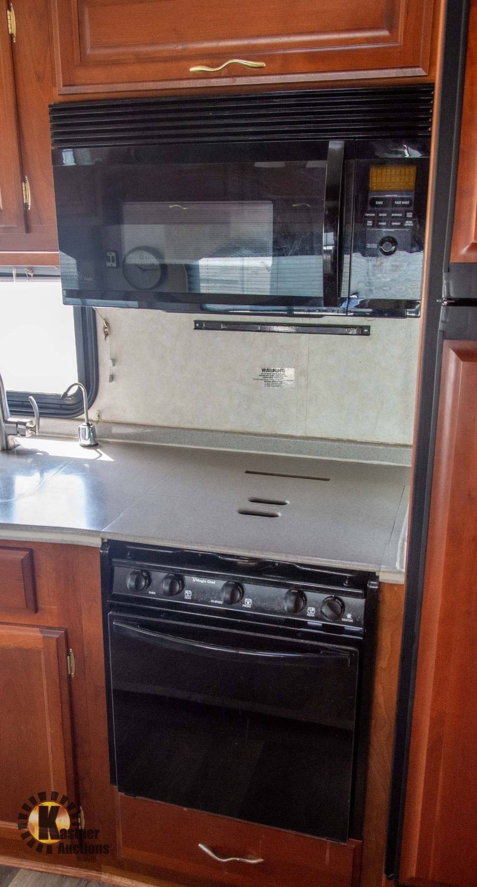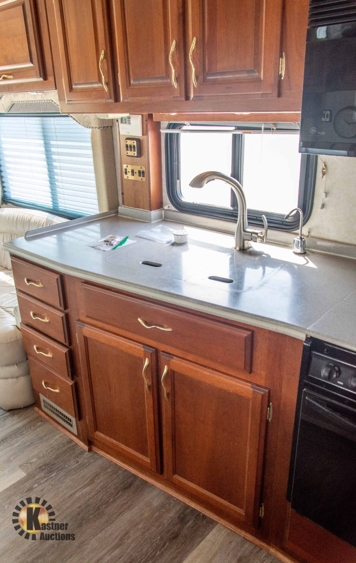 EXTERIOR FEATURES 5 POWER AWNINGS, WATER/GAS/SEWAGE HOOKUPS, AND MULTIPLE LOCKABLE STORAGE CABINETS ON EITHER SIDE. TRAILER HITCH INSTALLED WITH FLAT TOWING VEHICLE ATTACHMENT.