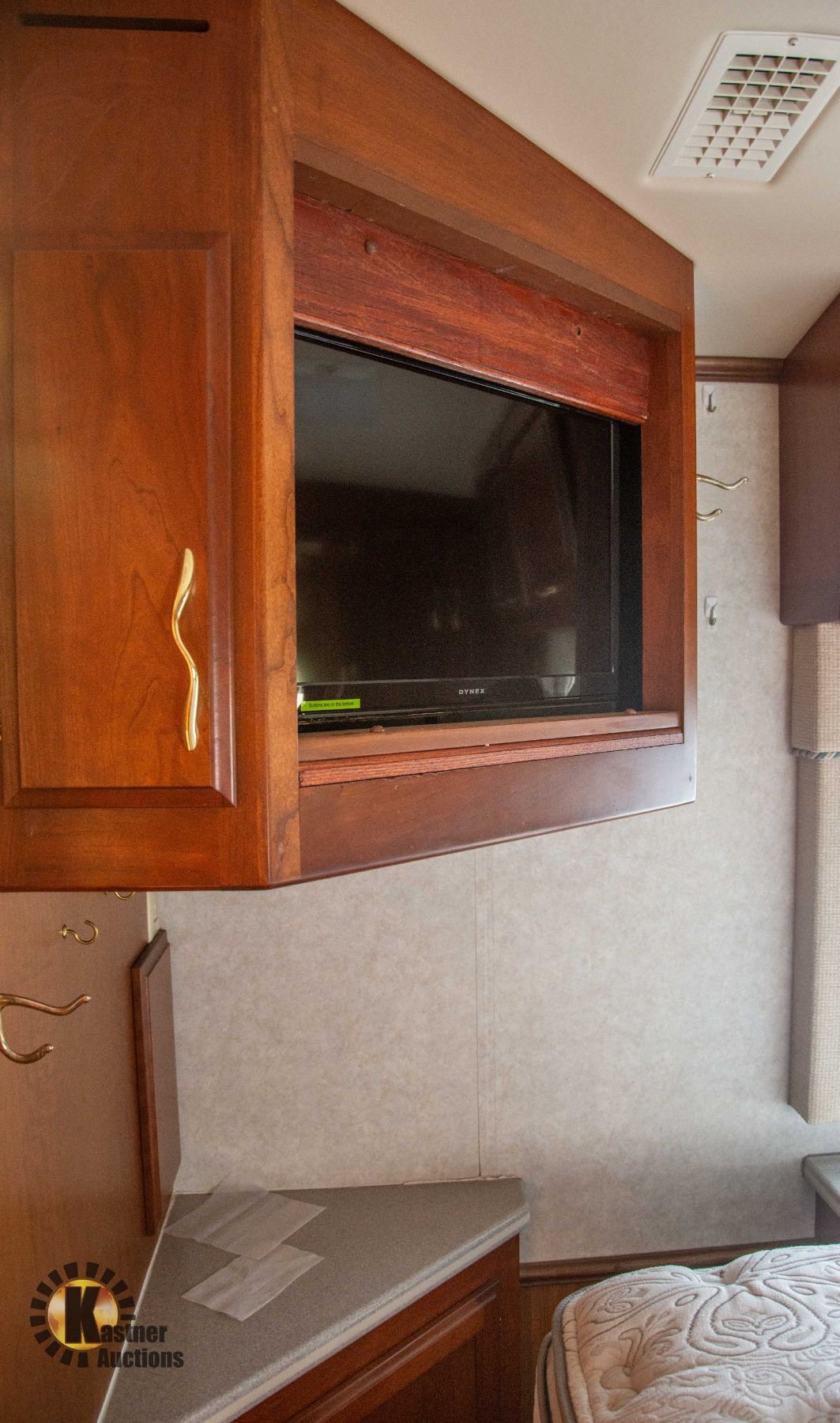 BEDROOM FEATURES SLIDE OUT, KING SIZE MATTRESS, 27" DYNEX MOUNTED TV, FULL CLOSET STORAGE SYSTEM, MIRRORED ACCENTS AND QUARTZ SURFACES. VINYL AND TILE FLOORING, THE UNIT FEATURES MANY MIRRORED AND QUARTZ ACCENTS ALL THROUGHOUT.