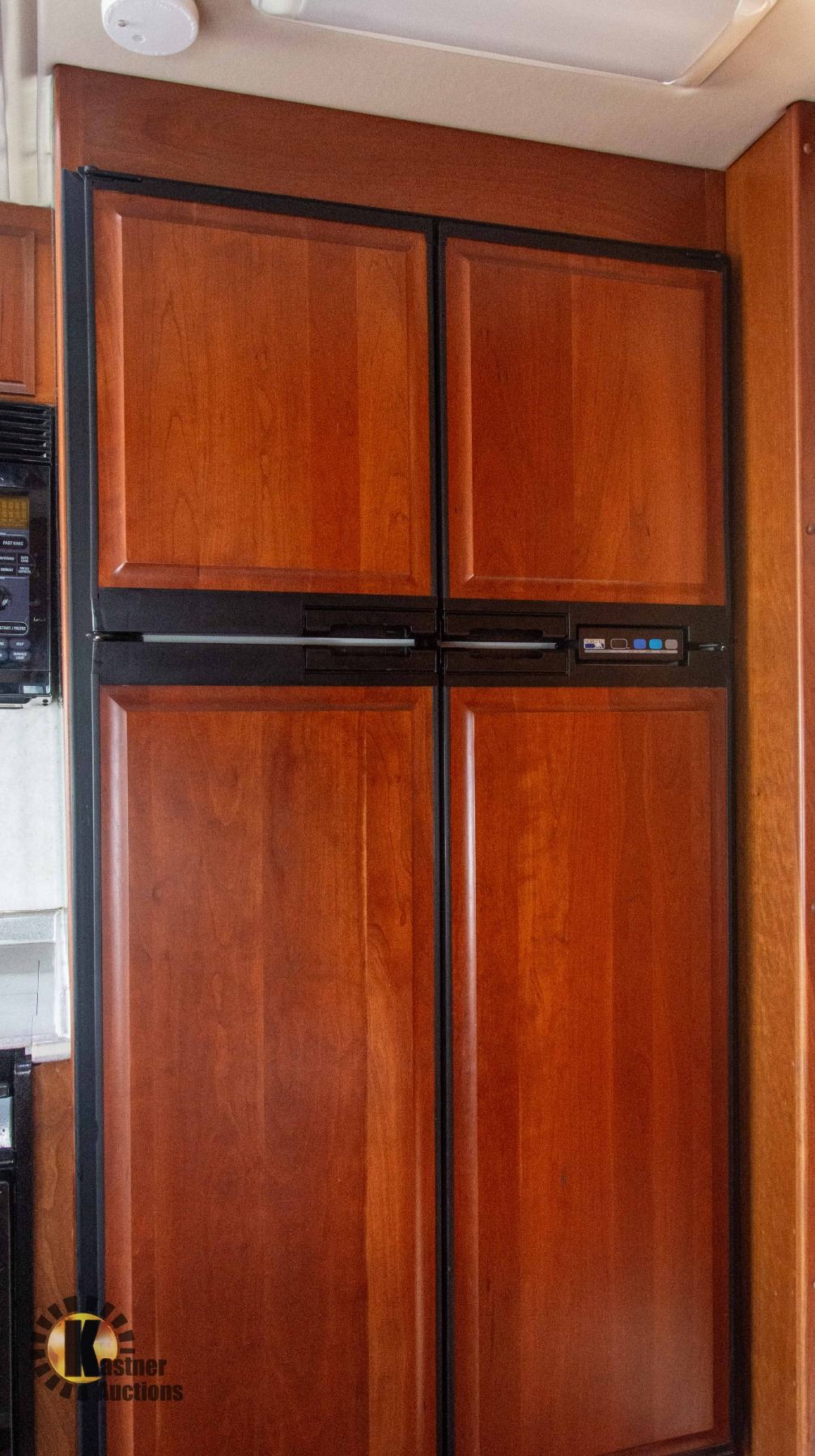 INTERIOR FEATURES MATCHING MODERN CABINETRY ALL THROUGHOUT. SAMSUNG 27" TV MOUNTED AT THE FRONT OF THE UNIT. RV COMFORT ZC THERMOSTAT MONITORS INTERIOR TEMPERATURES. MATCHING LEATHER LOVE SEAT AND SOFA WITH SLIDE OUT STORAGE UNDERNEATH. FULL SIZE QUARTZ KITCHEN COUNTERTOP WITH DOUBLE SINK AND QUARTZ SINK COVERS. 3 BURNER GAS STOVE WITH MAGIC CHEF 2.5 CU FT OVEN. GE FULL SIZED MICROWAVE, NORCOLD DOUBLE FRIDGE FREEZER WITH MATCHING CABINET FINISH.