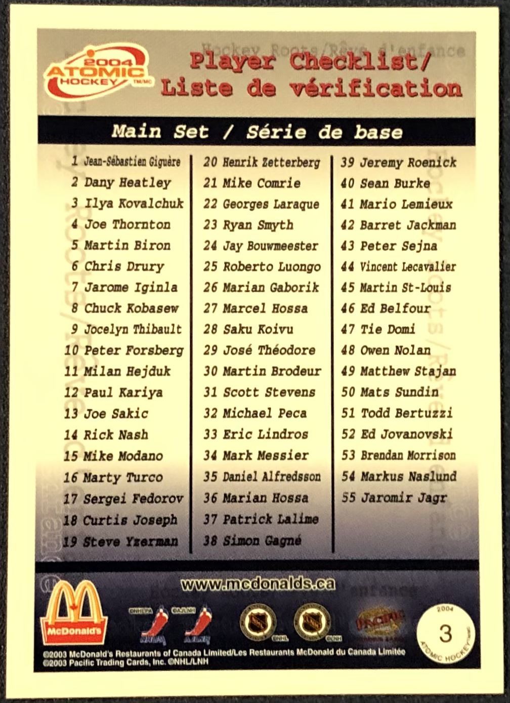 McDonald's card #3 NHL, hockey, hall of fame, regional