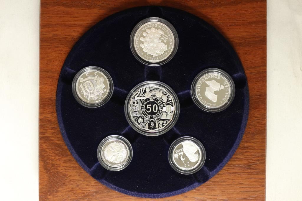 NATURAL WOOD PRESENTATION CASE, 6 COINS, ALL FINE SILVER, ROYAL AUSTRALIAN MINT PACKAGING