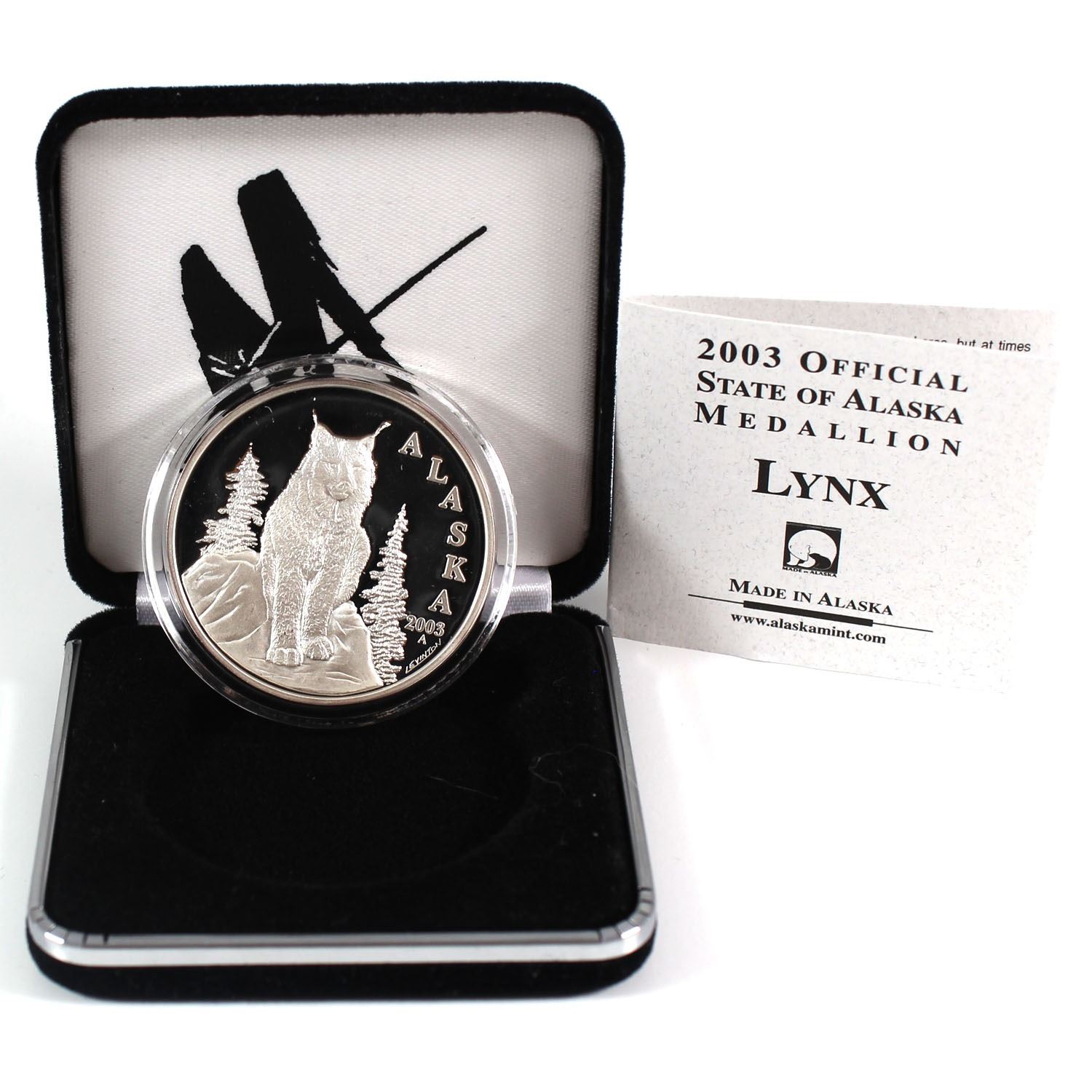 2003 Alaska 1oz Fine Silver Official LYNX Medallion (Tax Exempt) Medallion comes encapsulated in mint issued display case with COA.