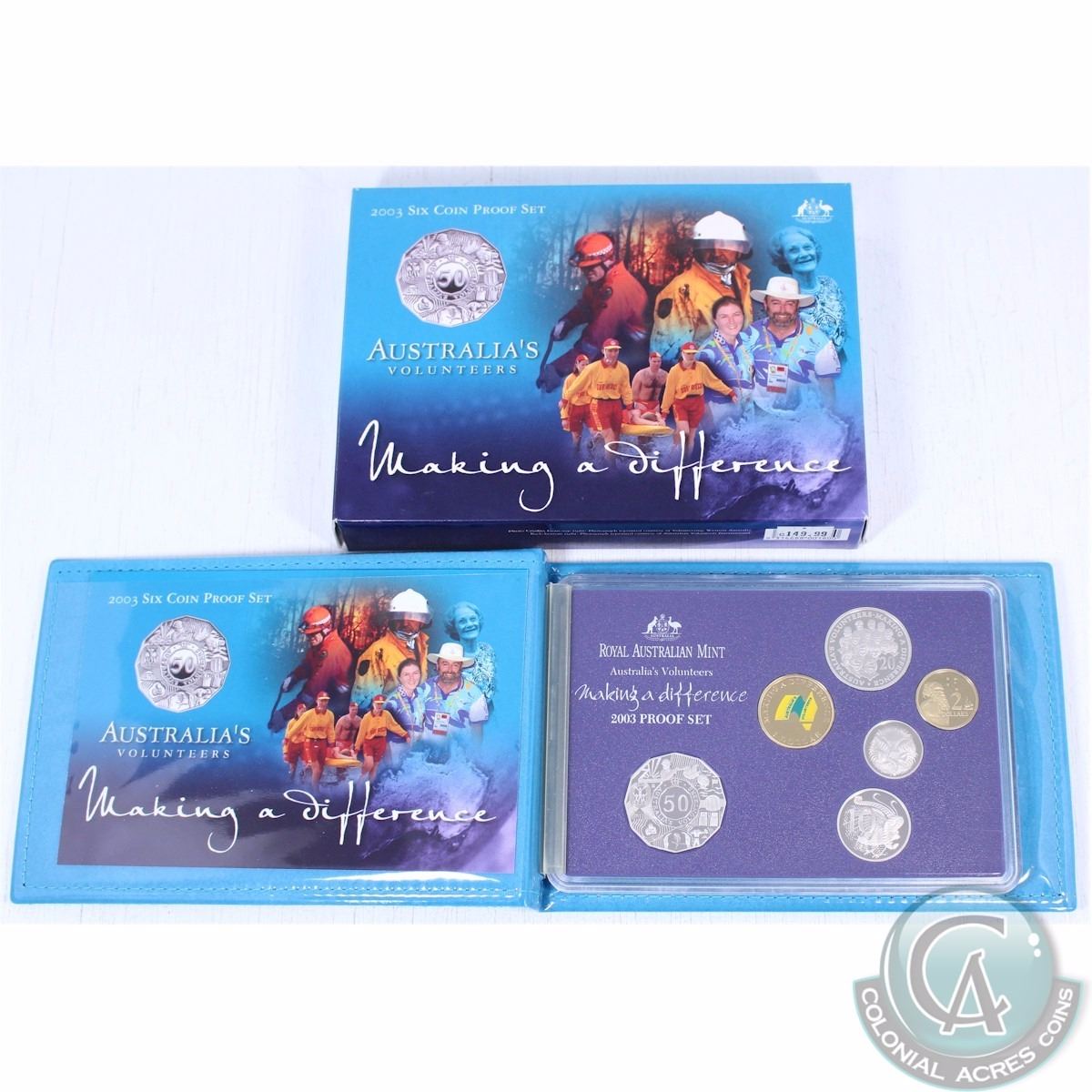 2003 Australia's Volunteers Six Coin Proof Set. This 2003 Commemorative set includes six Uncirculated coins: Two Dollars, the Commemorative "Australia's Volunteers" Coloured One Dollar, the Commemorative "Australia's Volunteers" Fifty cents, the Commemorative "Australia's Volunteers" Twenty cents, Ten cents, and Five cents coin.