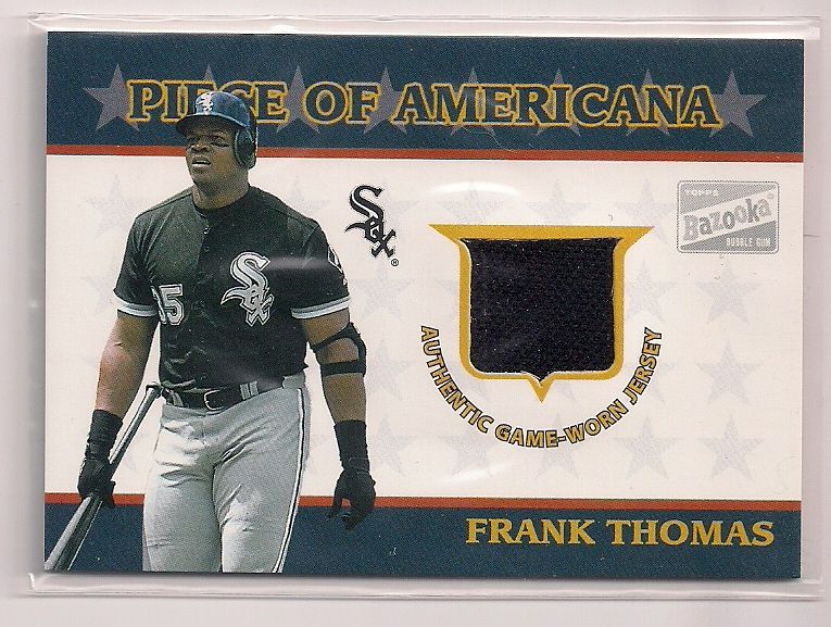 2003 Bazooka Frank Thomas Game-Worn Jersey Insert Card. This Insert of the Big Hurt features a Solid Black piece of Game-Worn Jersey, and is Near Mint.