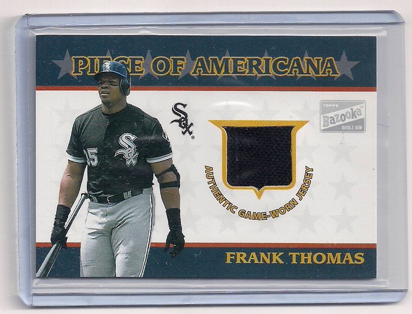 2003 Bazooka Piece of Americana Frank Thomas Game-Worn Jersey Insert Card. This Insert features a Solid Black piece of Game-Worn Jersey, and is Near Mint.