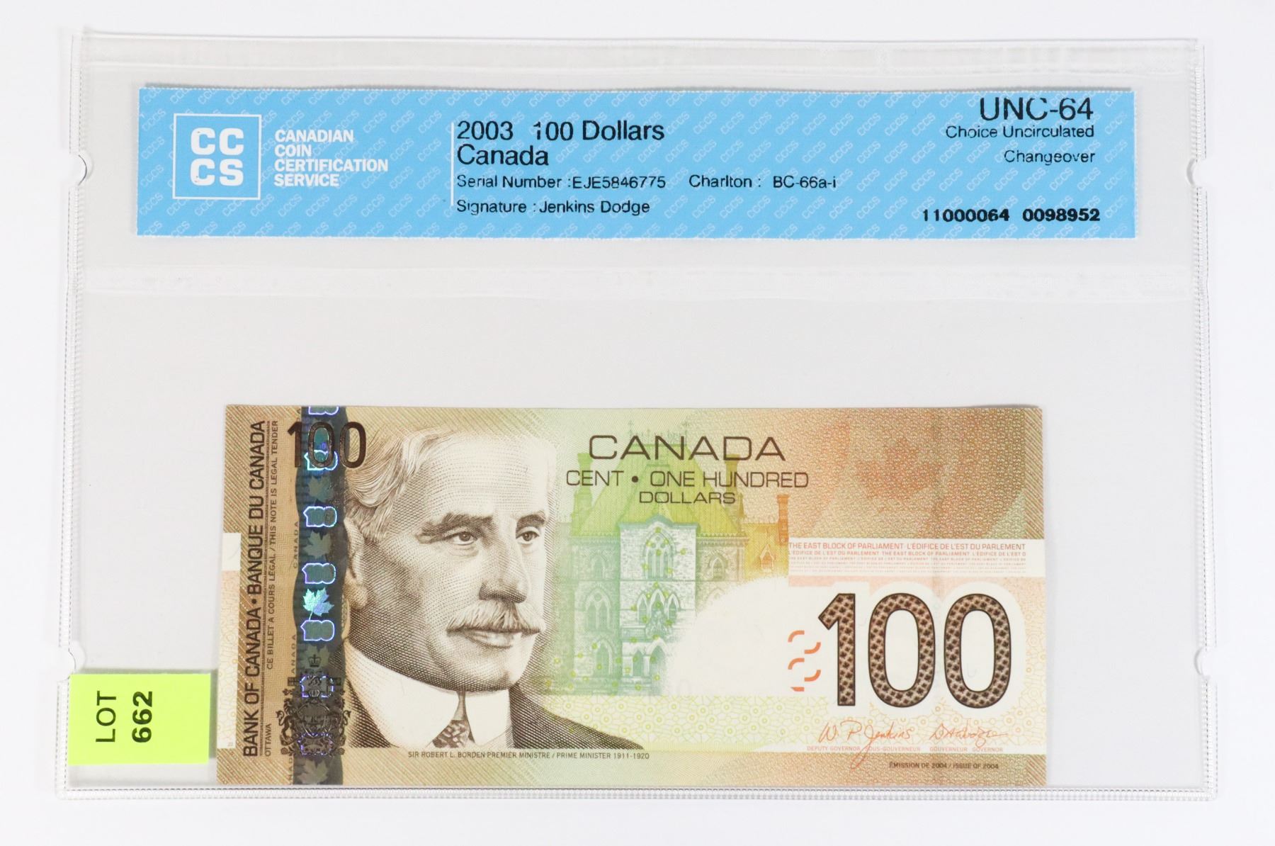 2003 CANADIAN 100 DOLLAR BANK NOTE GRADED UNC-64