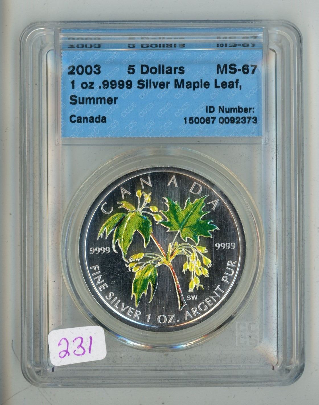 2003 CCCS graded, "Silver Maple Leaf - Summer" Canadian 5 dollar - 1oz fine silver coin - MS67