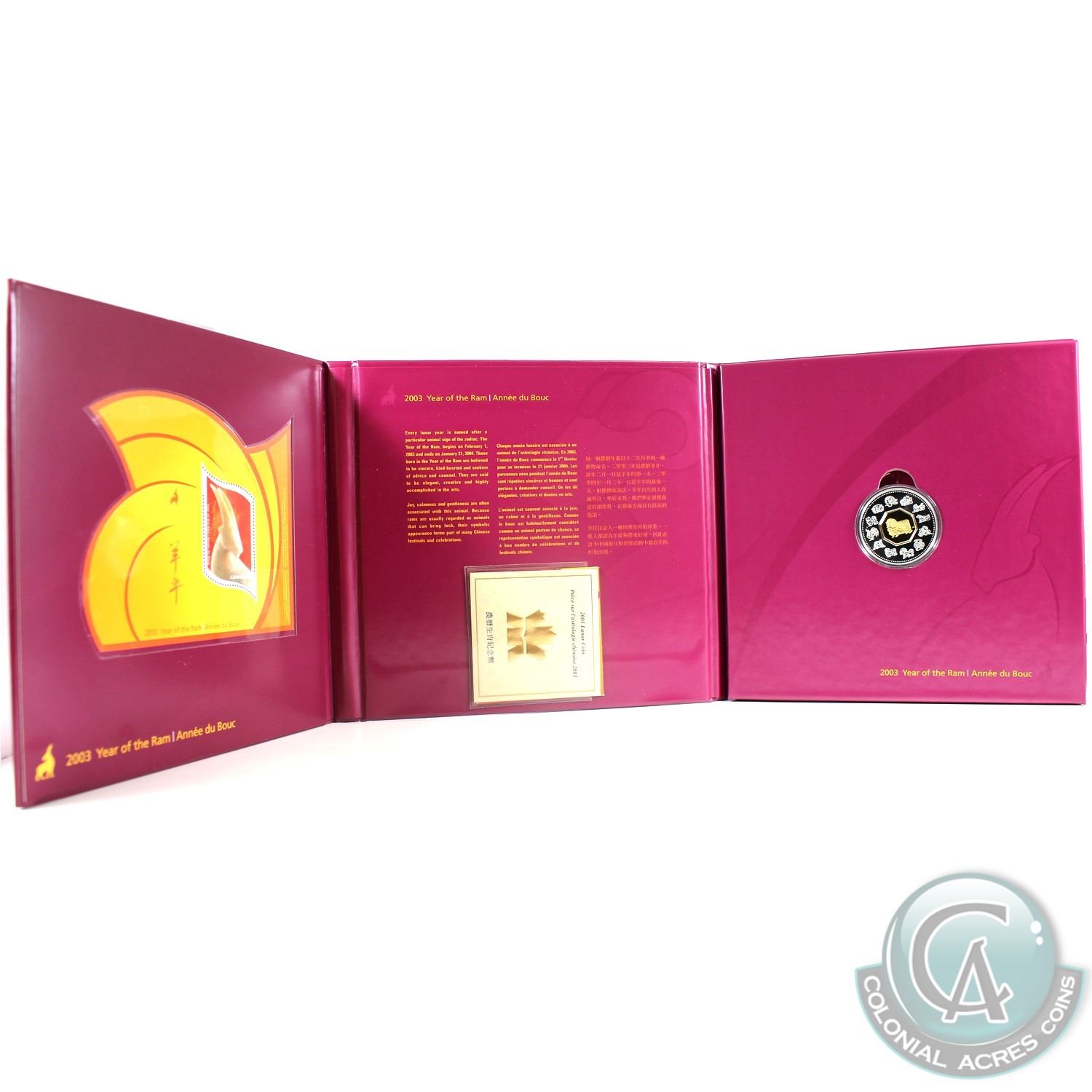 2003 Canada $15 Year of the Ram Sterling Silver and Gold Plated Cameo Coin and Stamp Set with all Original Packaging from the RCM and Canada Post.