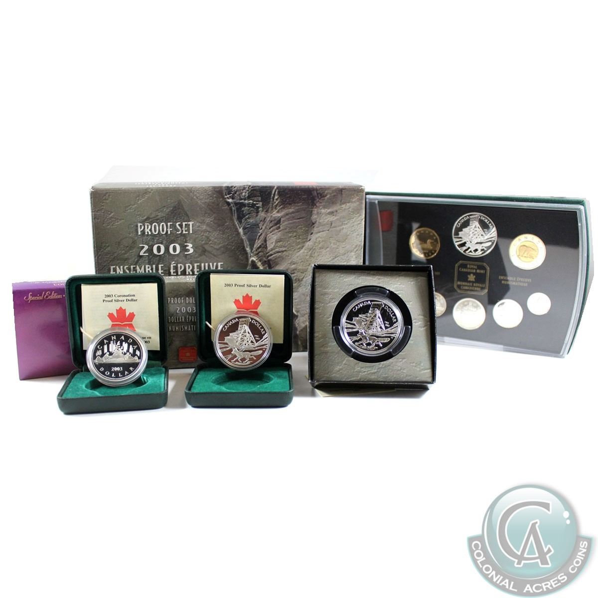 2003 Canada RCM Estate Lot. You will receive the following: 2003 Proof Dollar, 2003 Coronation Proof Dollar, 2003 Brilliant Uncirculated Dollar, and 2003 Proof Set. Please note some coins contain faint toning. 4pcs.