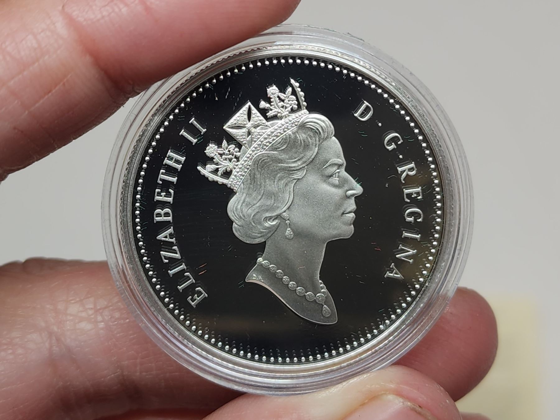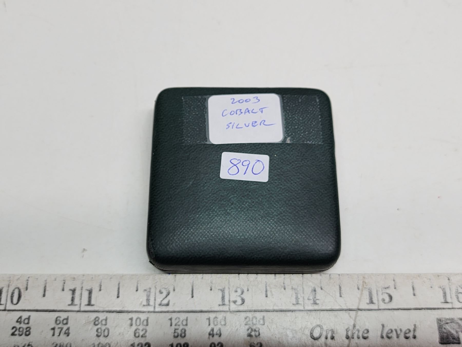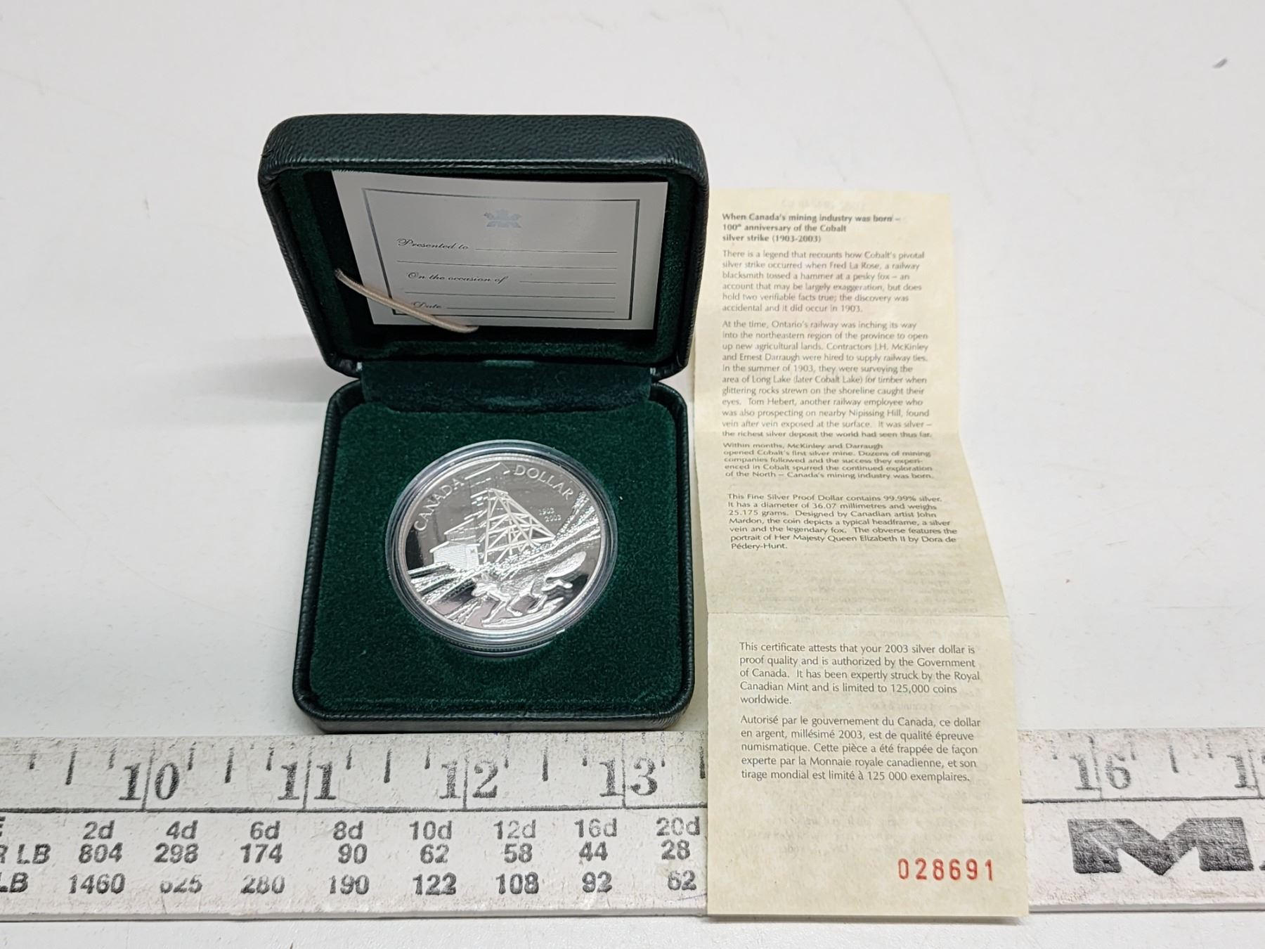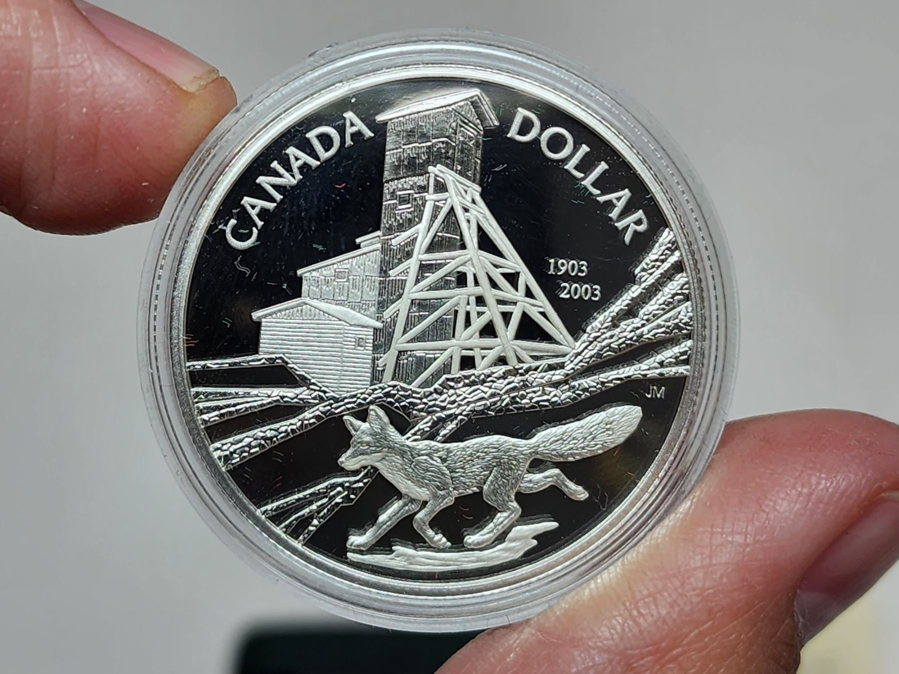 2003 Cobalt Centennial Silver Dollar. Commemorates a blacksmith throwing his hammer at a fox (missing the fox but hitting a rich vein of silver). Proof with Ultra Heavy Cameo. Housed in its original case of issue. Bright White.