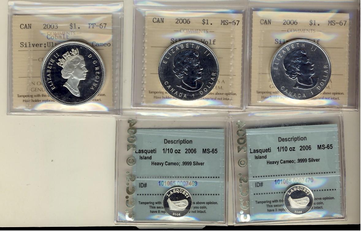 2003 Cobalt PF67 & 2006 $1 Silver Wolf MS67. Both graded ICCS along with CCCS 1/10 Silver 2006 Lasqueti Mint. Lot of 5 coins.