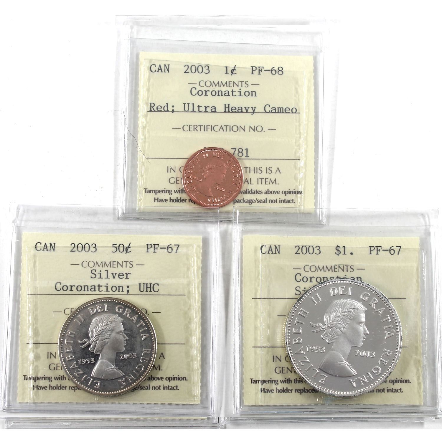 2003 Coronation 1-cent PF-68 UHC, 2003 Silver Coronation 50-cents PF-67 UHC & 2003 Coronation Silver Dollar PF-67 UHC all ICCS Certified. 3pcs