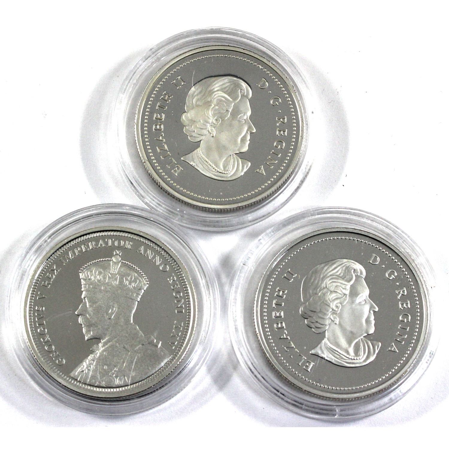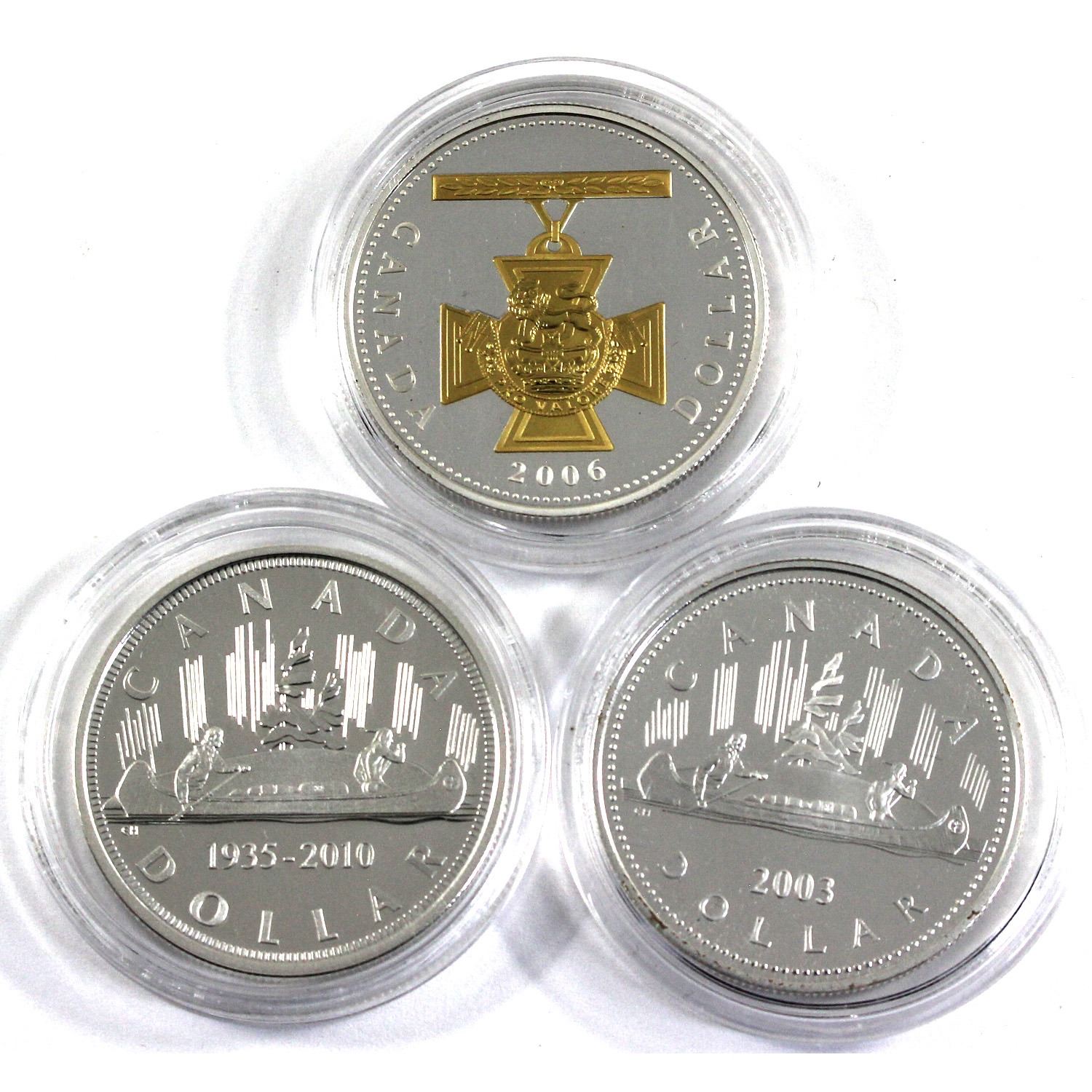 2003 Coronation Commemorative, 2006 Gold Plated Victoria Cross & 1935-2010 Voyageur Commemorative Canada Proof Silver Dollars. 3pcs (TAX Exempt)