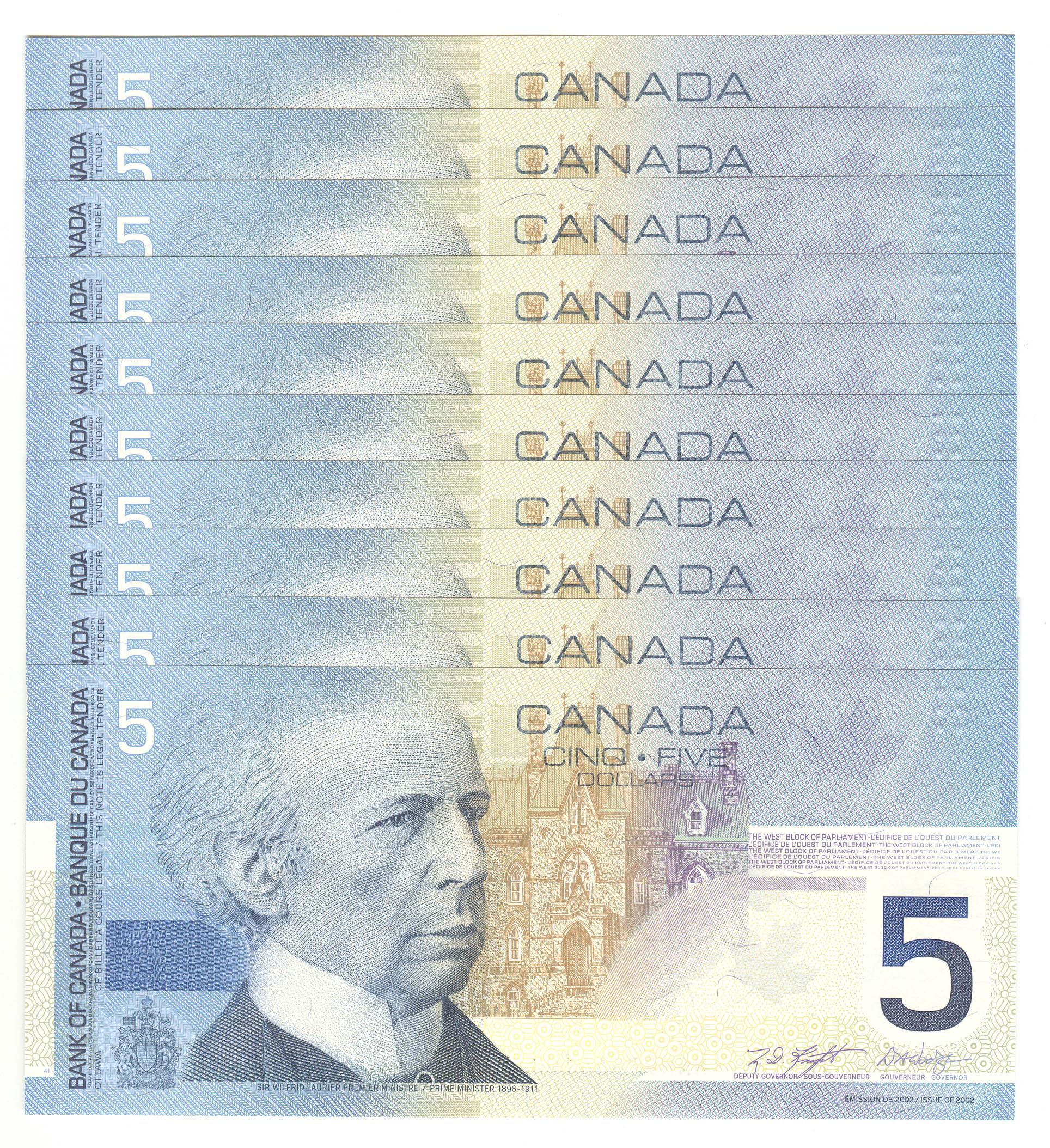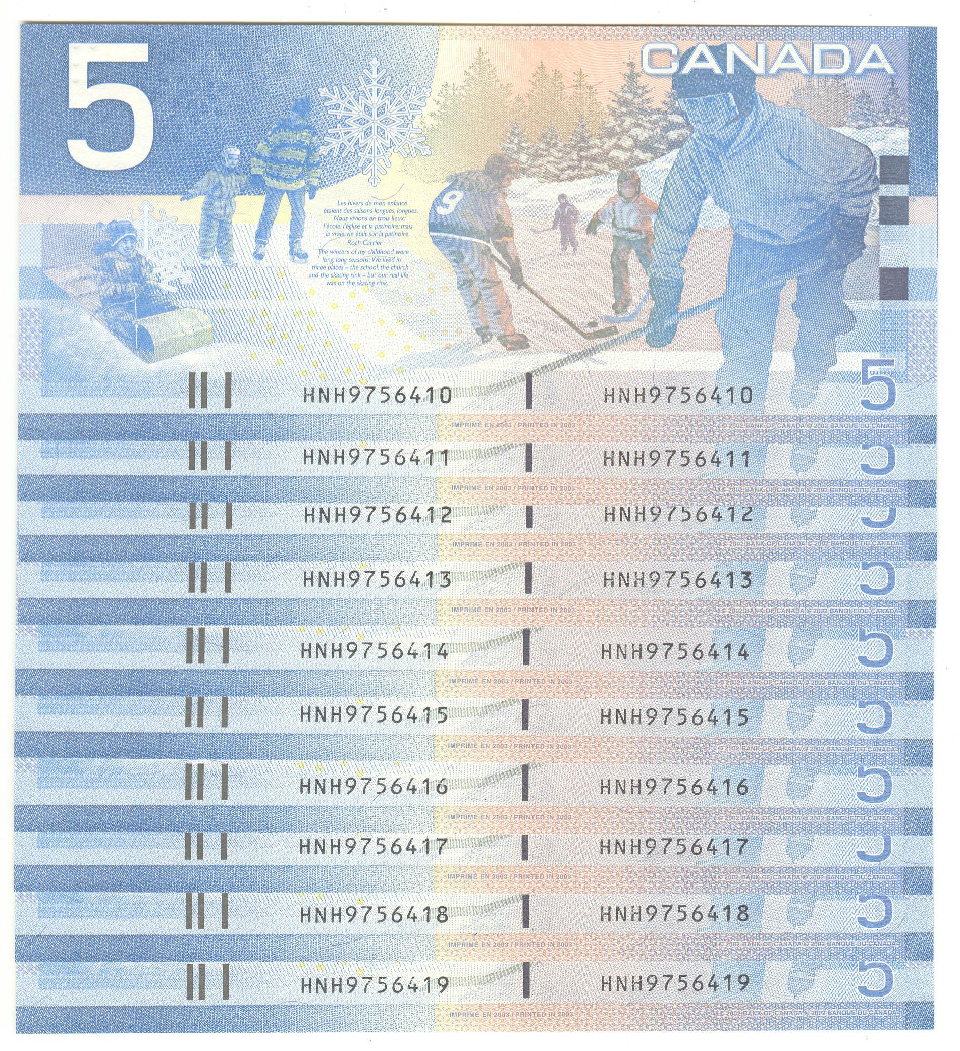 2003 Five Dollars 10 Consecutive Replacement, BC-62aA-i, GEM UNC, Knight Dodge, serial HNH9756410-11-12-13-14-15-16-17-18-19, insert range 9.400M - 9.840M.