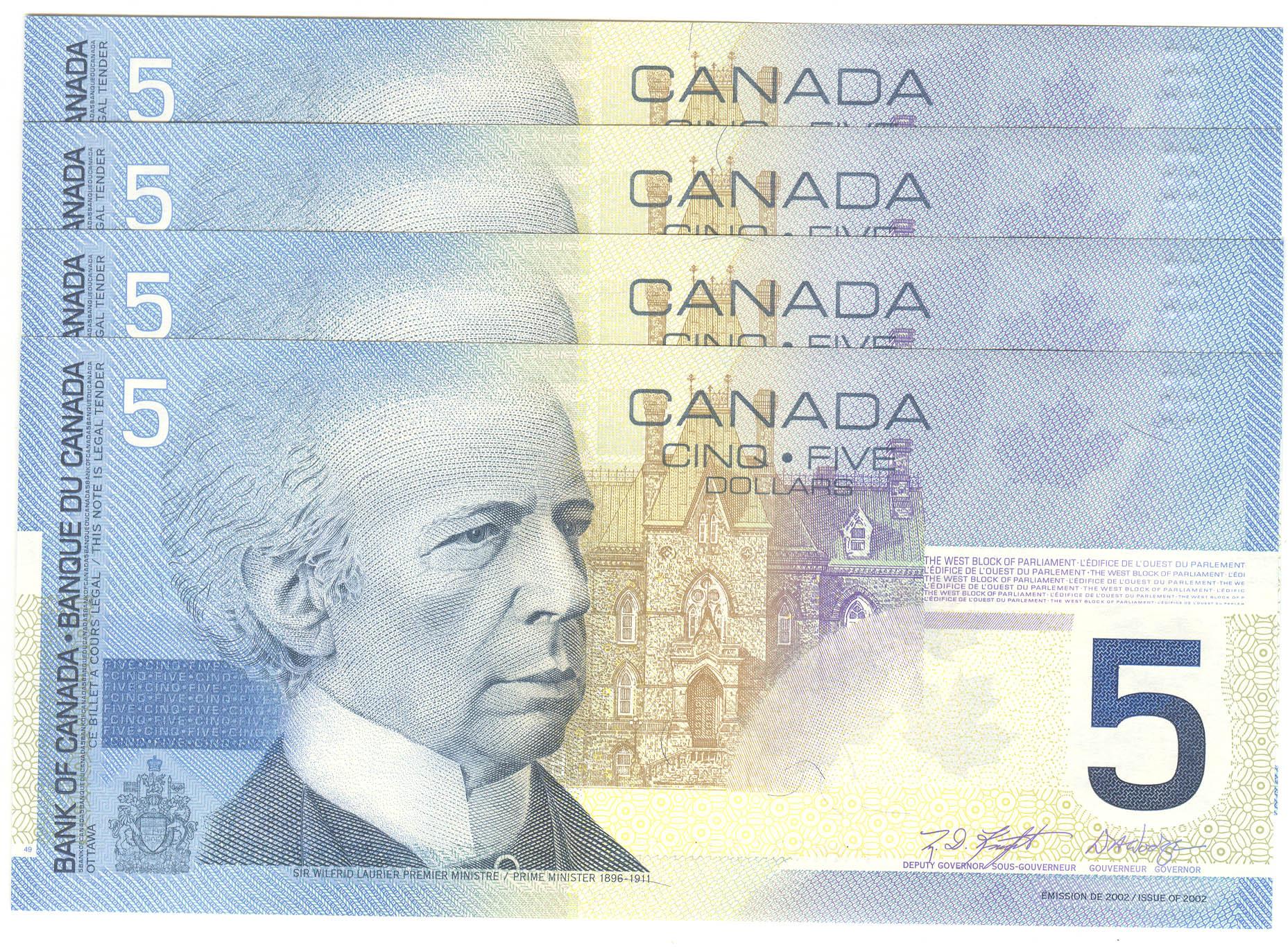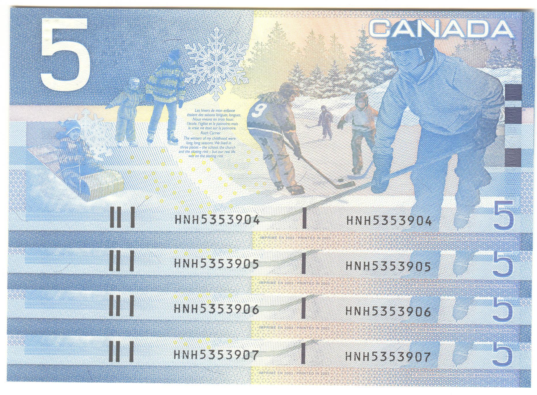2003 Five Dollars 4 Consecutive Replacement, BC-62aA-i, GEM UNC, Knight Dodge, serial HNH5353904-05-06-07, insert range 5.200M - 5.600M.