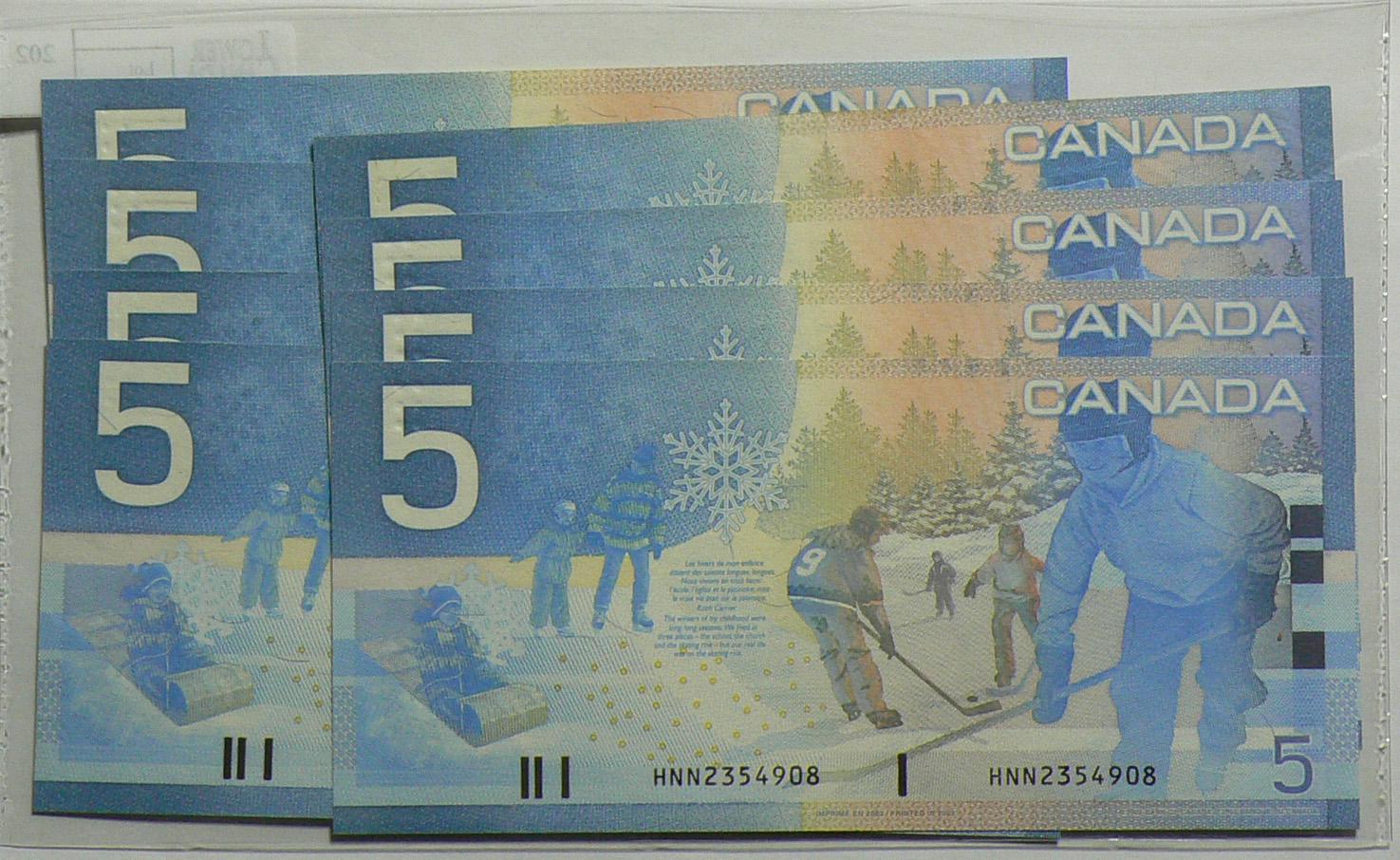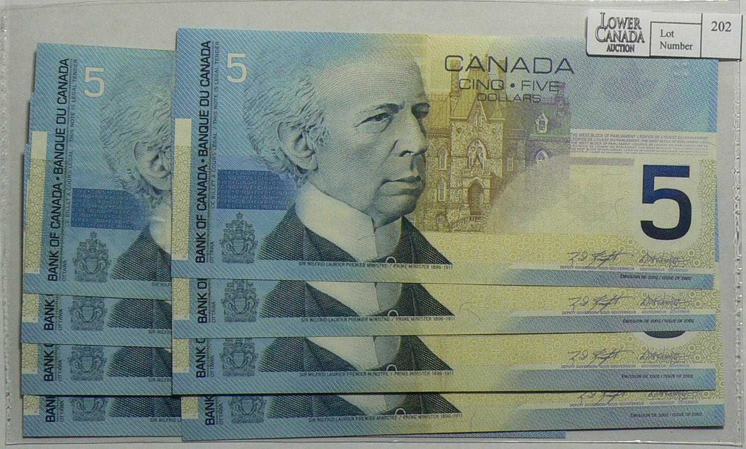 2003 Five Dollars Consecutive lot, BC-62a-i, GEM UNC, Knight Dodge, serial HNN1283721-22, HNN2354908-09-10-11 & HNN2616433-34. Lot of 8 notes.