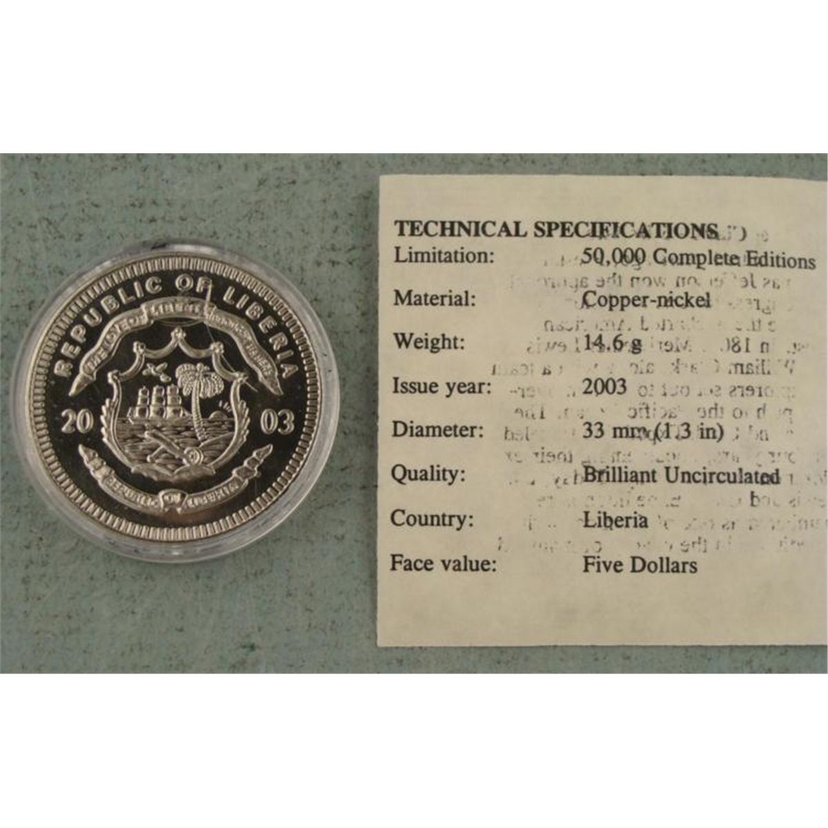 Here is a 2003 GEM, uncirculated commemorative coin from Liberia. On one side is a picture of Lewis and Clark on an expedition and reads Lewis and Clark-Exploring the West. On the other side is a picture of an island, ship, sunset, and plane and reads Republic of Liberia, 2003. * * The diameter of the coin is 33 mm. The coin comes in a protective case and with a Certificate of Authenticity from American Mint. *
