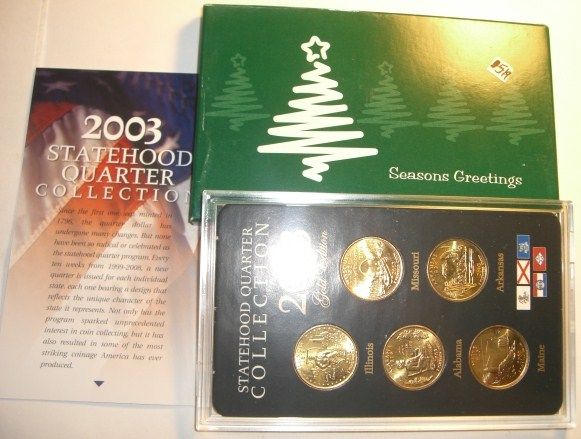 2003 GOLD EDITION STATEHOOD QUARTER COLLECTION *INCLUDES IL/AL/ME/MO/AK*!! COMES IN HOLIDAY PACKAGE!! SET CAME OUT OF SAFE DEPOSIT BOX!! ***Coin, Currency & All Items Listed in this auction - Grades, Conditions and Values are not Safe Deposit Coins LLC Responsibilty. Grades, Condition and Values are determined by Consigner(s) & Buyers ONLY