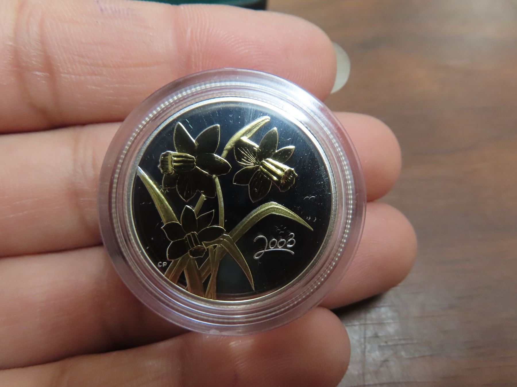 2003 Golden Daffodil 50 Cents. Sterling Silver with 24-karat Gold Plating. Proof with Ultra Heavy Cameo. Housed in its original Royal Canadian Mint case & box of issue.