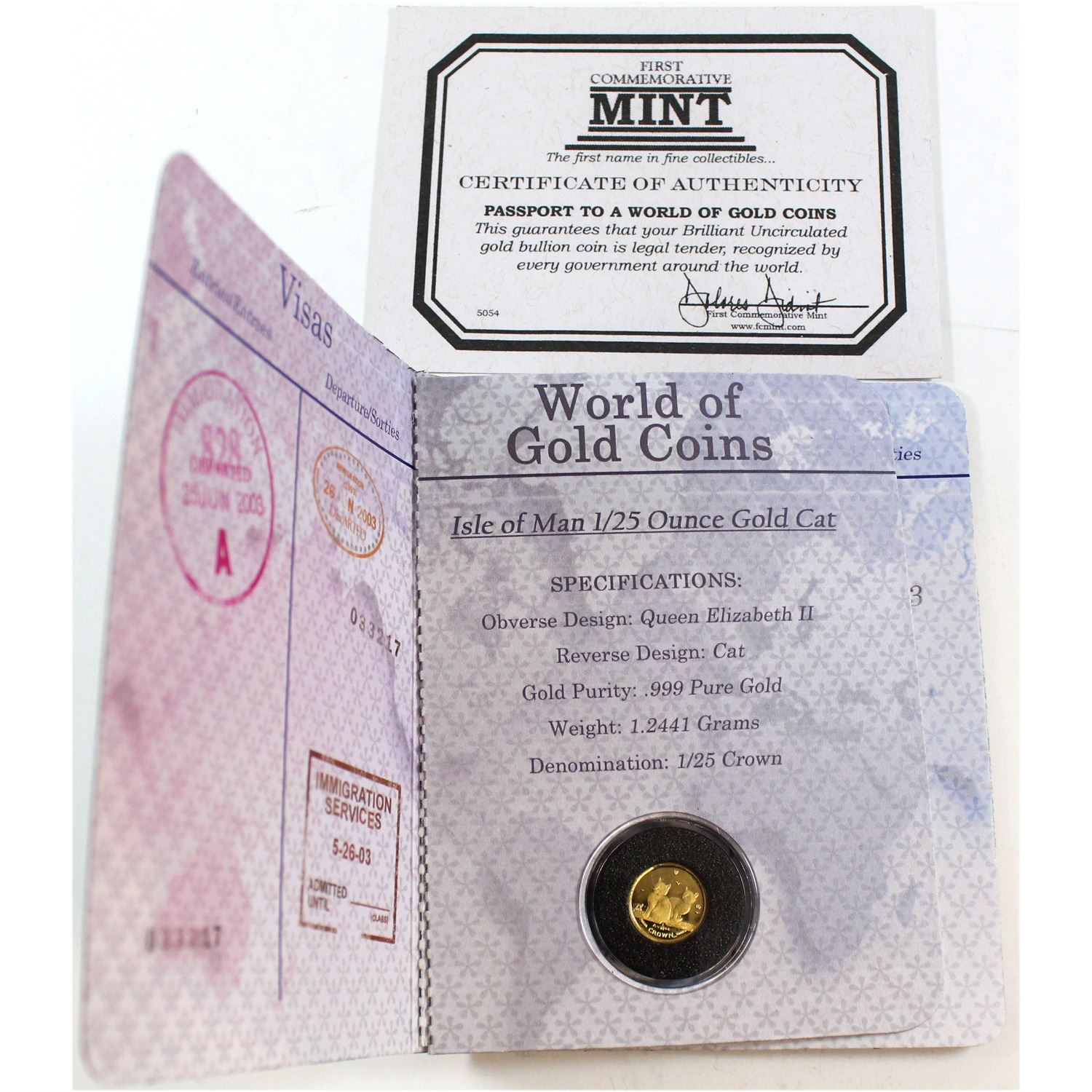 2003 Isle of Man 1/25oz Fine Gold - Cats (Tax Exempt). Comes encapsulated in a World of Gold Coins Passport with COA.