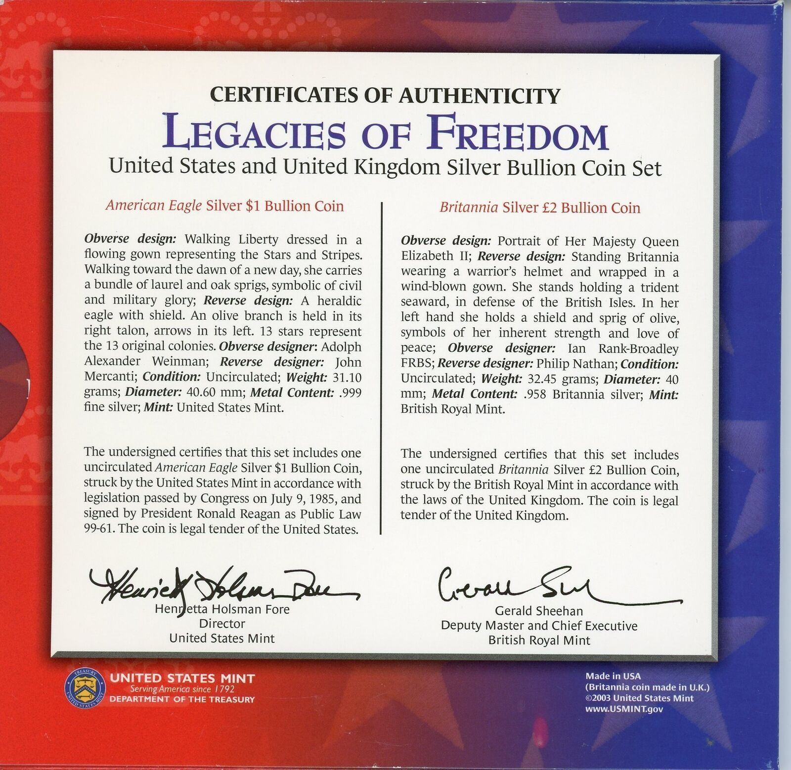 2003 Legacies of Freedom U.S. & United Kingdom Silver Bullion Coin Set
