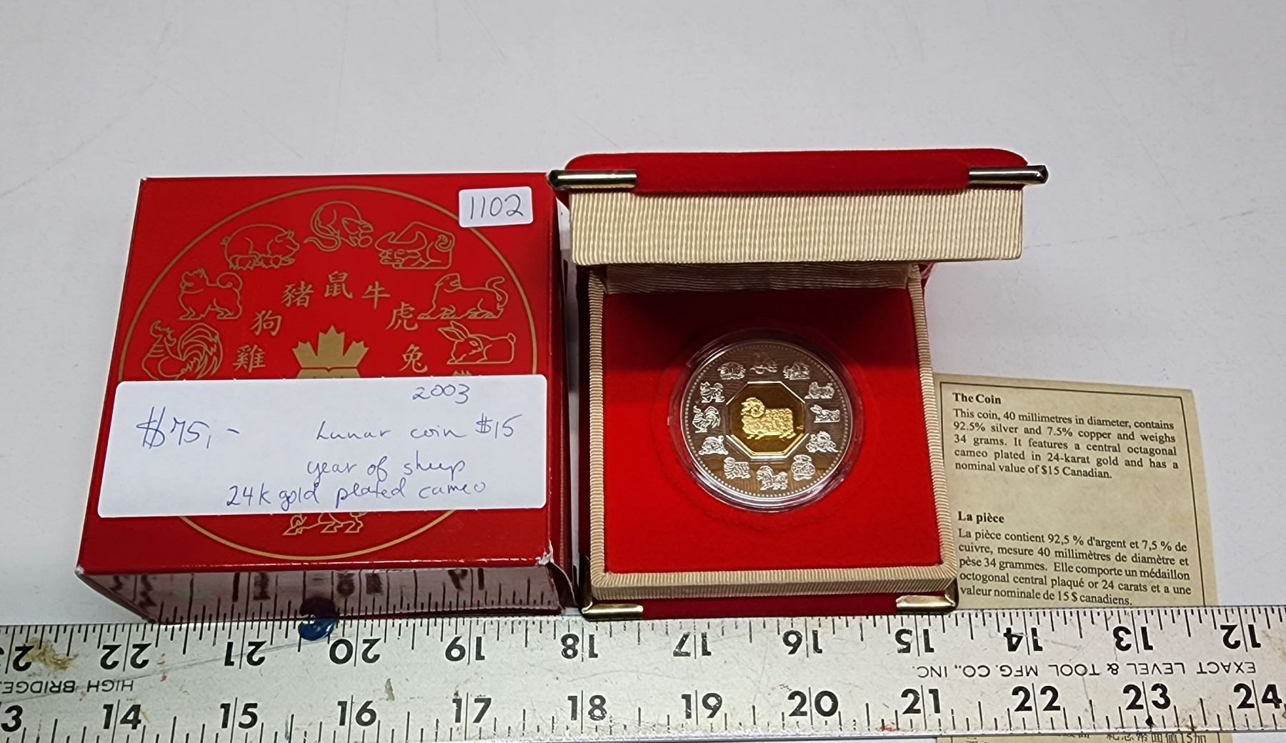 2003 Lunar Year of the Sheep $15. Sterling Silver with 24-karat gold plating on the Cameo. Proof. Housed in its original case & box of issue.