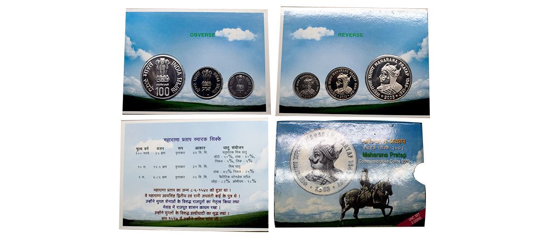 2003, Maharana Pratap, UNC set of 3 coins, 100 rupees, 10 rupees and 1 rupee, Mumbai mint, RB 263, i