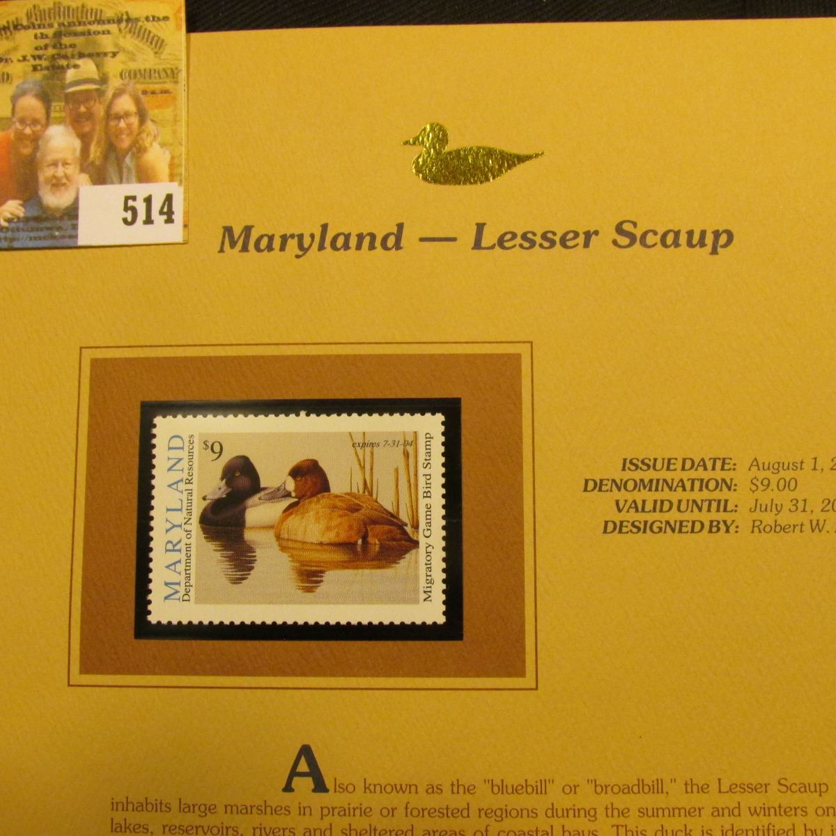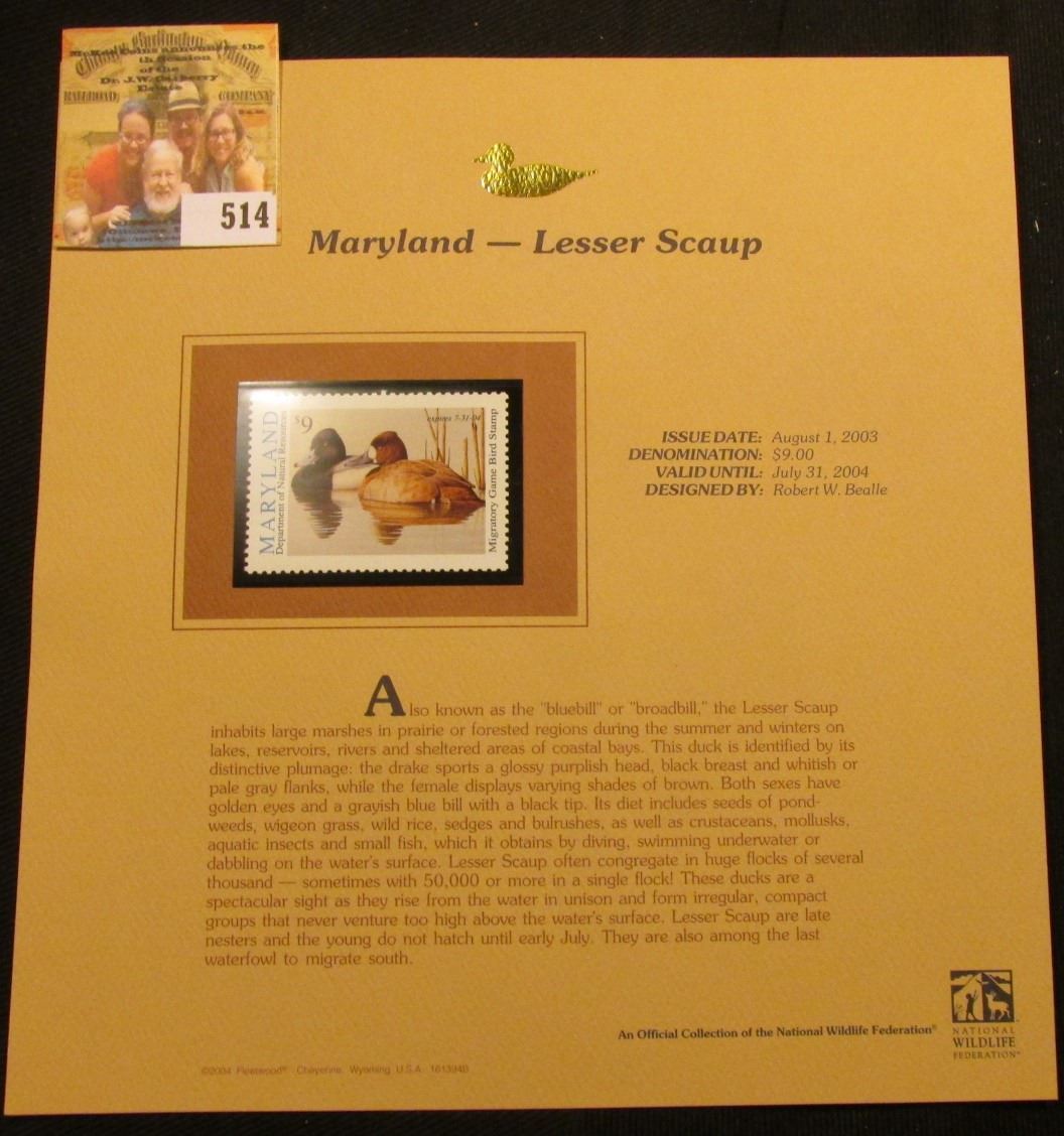 2003 Maryland Waterfowl $9.00 Stamp, mint, unused with original literature mounted in a plastic page. Depicts a pair of Lesser Scaup Ducks.