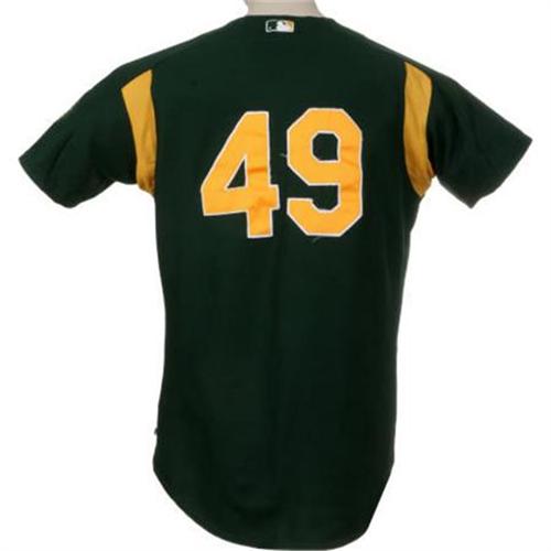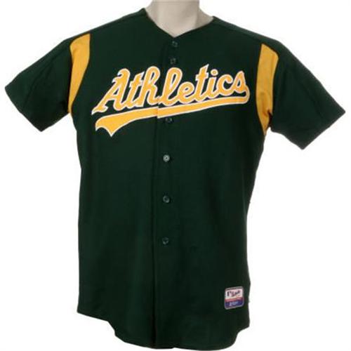 <B>2003 Mike Neu Batting Practice Worn Jersey.</B></I> Relief pitcher Mike Neu spent the 2003 season as a member of the Oakland Athletics, and here we present his green batting practice jersey from that year. Exceptional game use is evident, with snags throughout, as well as exceptional wear to the tackle twill "Athletics" on chest and rear numerals. Prime example of the A's batting practice digs from this era. Includes A's Spring Training sleeve patch.<BR><BR><b>Shipping:</b> Clothing, Costumes & Jerseys (<a target="_blank" href="http://www.heritageauctions.com/common/shipping.php">view shipping information</a>)