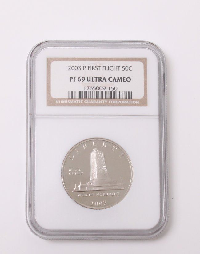 2003 P First Flight 50C Fifty Cent piece. Graded Proof 69 Ultra Cameo. SIZE: see attached ruler photo. Photos are part of the description representing the condition report and can be used for authentication prior to the sale date. Pangaea Auctions urges Bidder's to view all attached photos in detail.