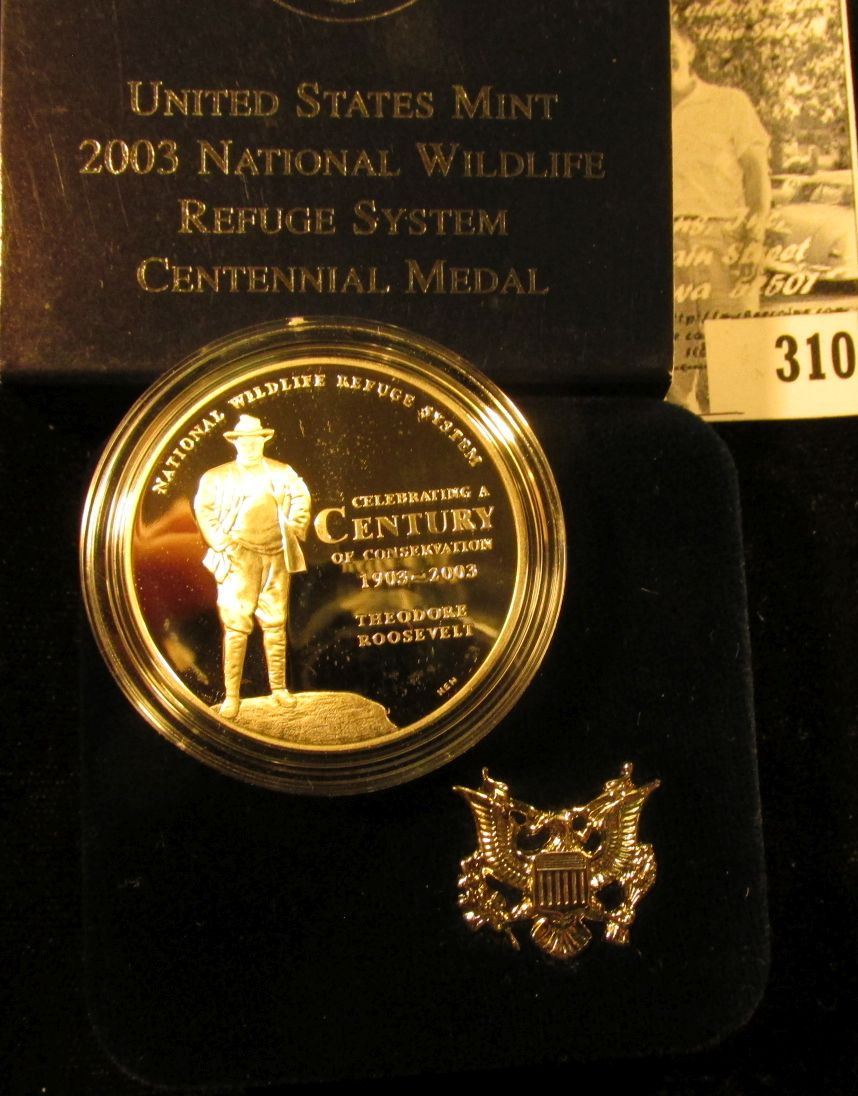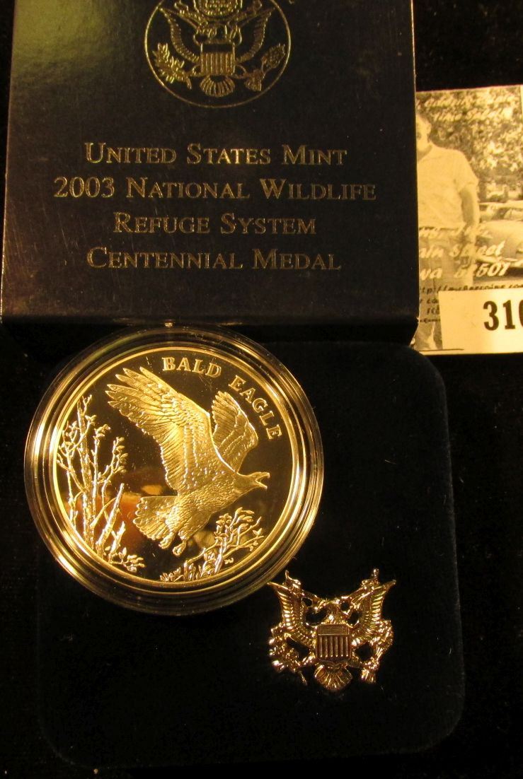 2003 P National Wildlife Refuge System Centennial Medal depicting the Bald Eagle, Proof, 26.73 grams of 90% Silver, 10% alloy, 1.5" diameter in original velvet-lined case of issue.