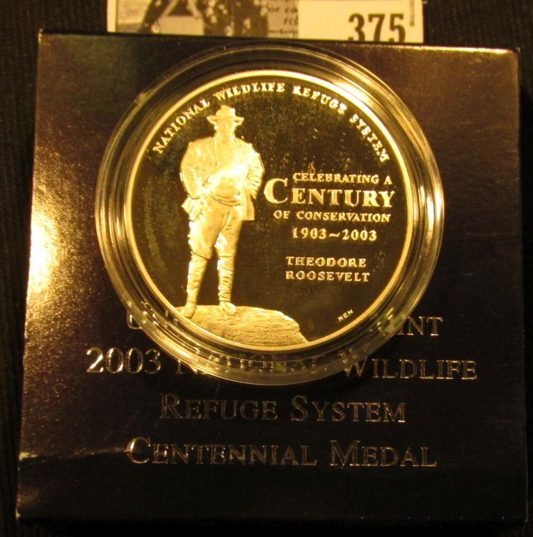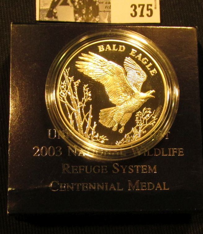 2003 P National Wildlife Refuge System Centennial Medal depicting the Bald Eagle, Proof, 26.73 grams of 90% Silver, 10% alloy, 1.5" diameter in original velvet-lined case of issue.