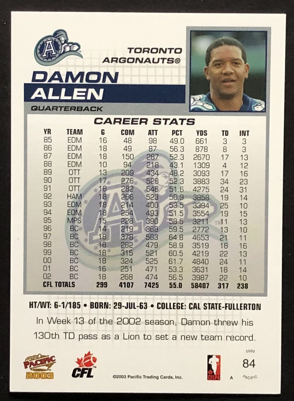 Card #84 CFL, football, hall of fame