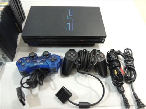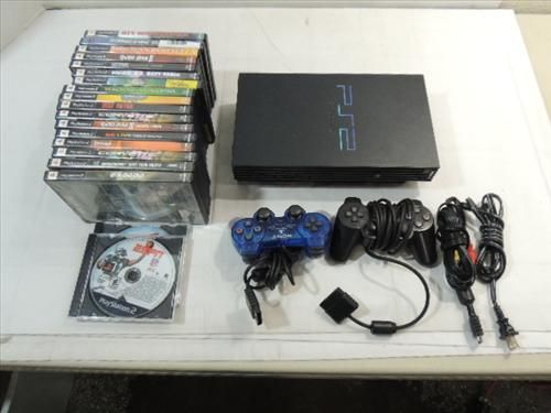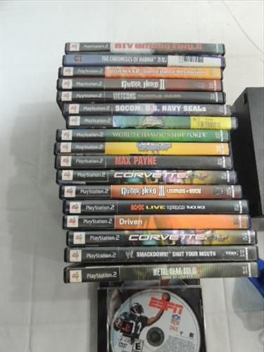 2003 PLAYSTATION 2 CONSOLE, 2 CONTROLLERS, VIDEO CONNECTOR AND 19 GAMES: MAX PAYNE, DRIVEN, GUITAR HERO, CORVETTE AND MUCH MORE. AS SHOWN. VIEW PICTURE FOR DETAIL.