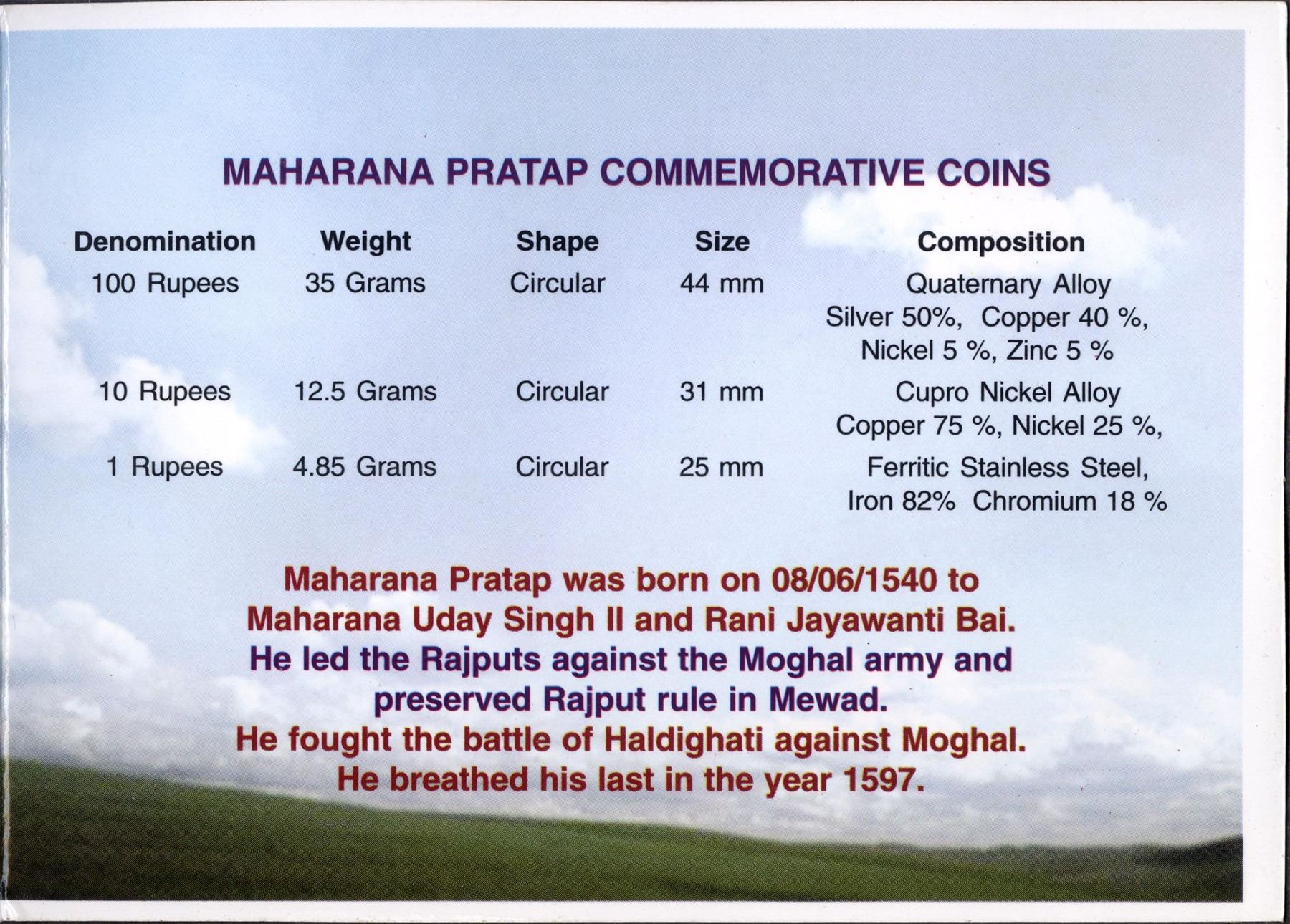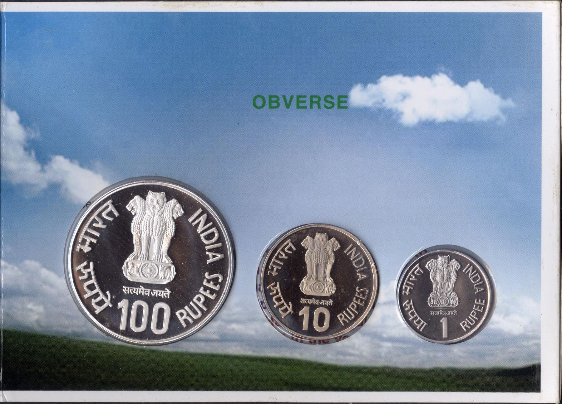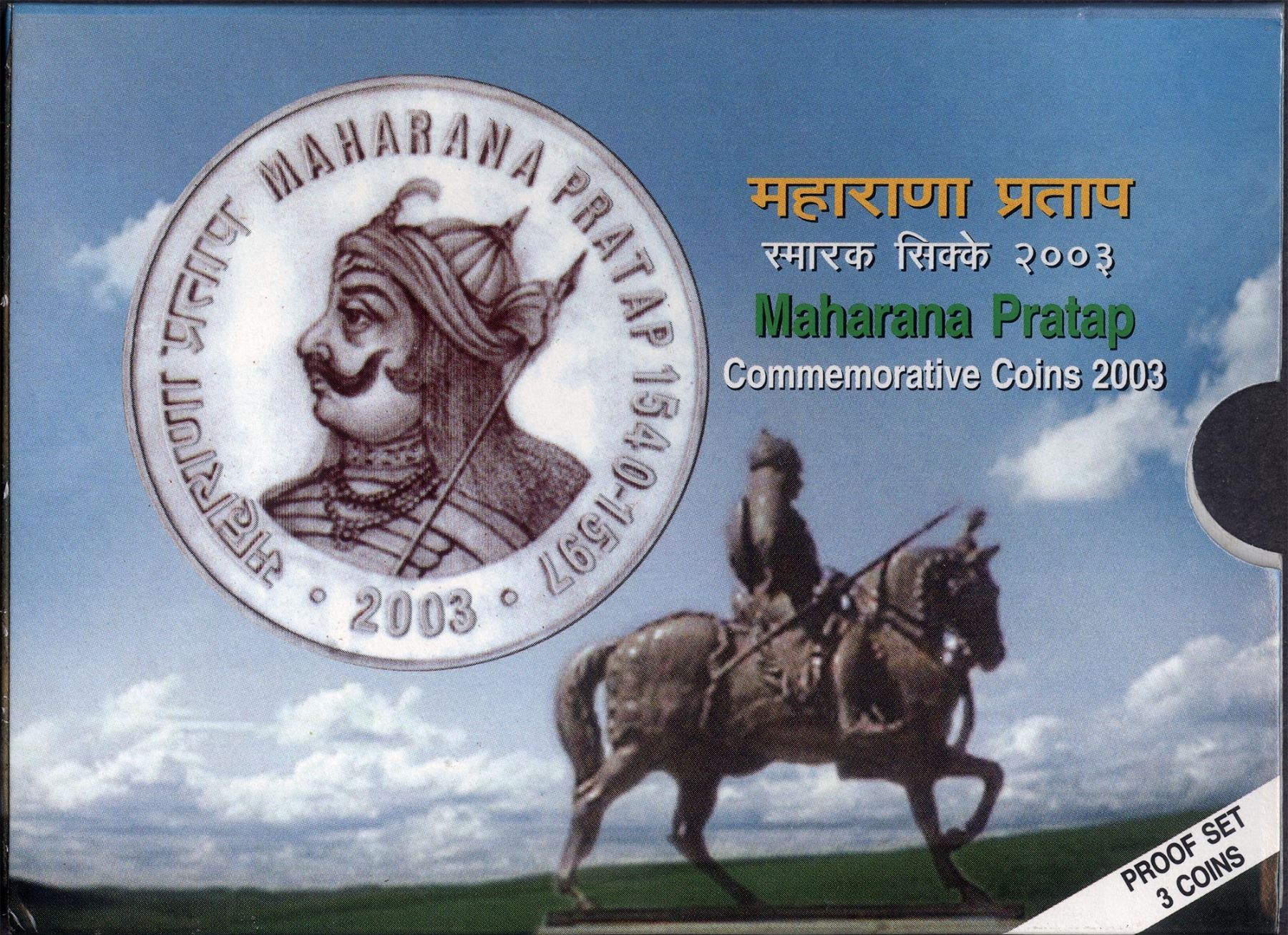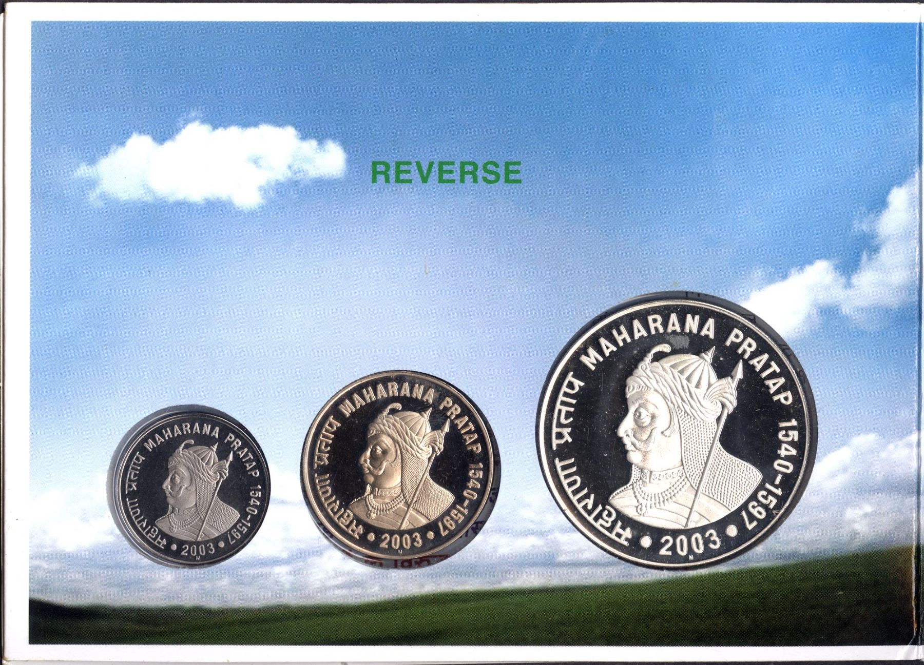 Republic India,2003, Proof Set, Maharana Pratap, Set of 3 Coins, Silver 100 Rupees, Copper Nickel 10 Rupees & Steel 1 Rupee, Bombay mint,(RB # 262), intact in the blister pack, preserved in the original packing, Proof.