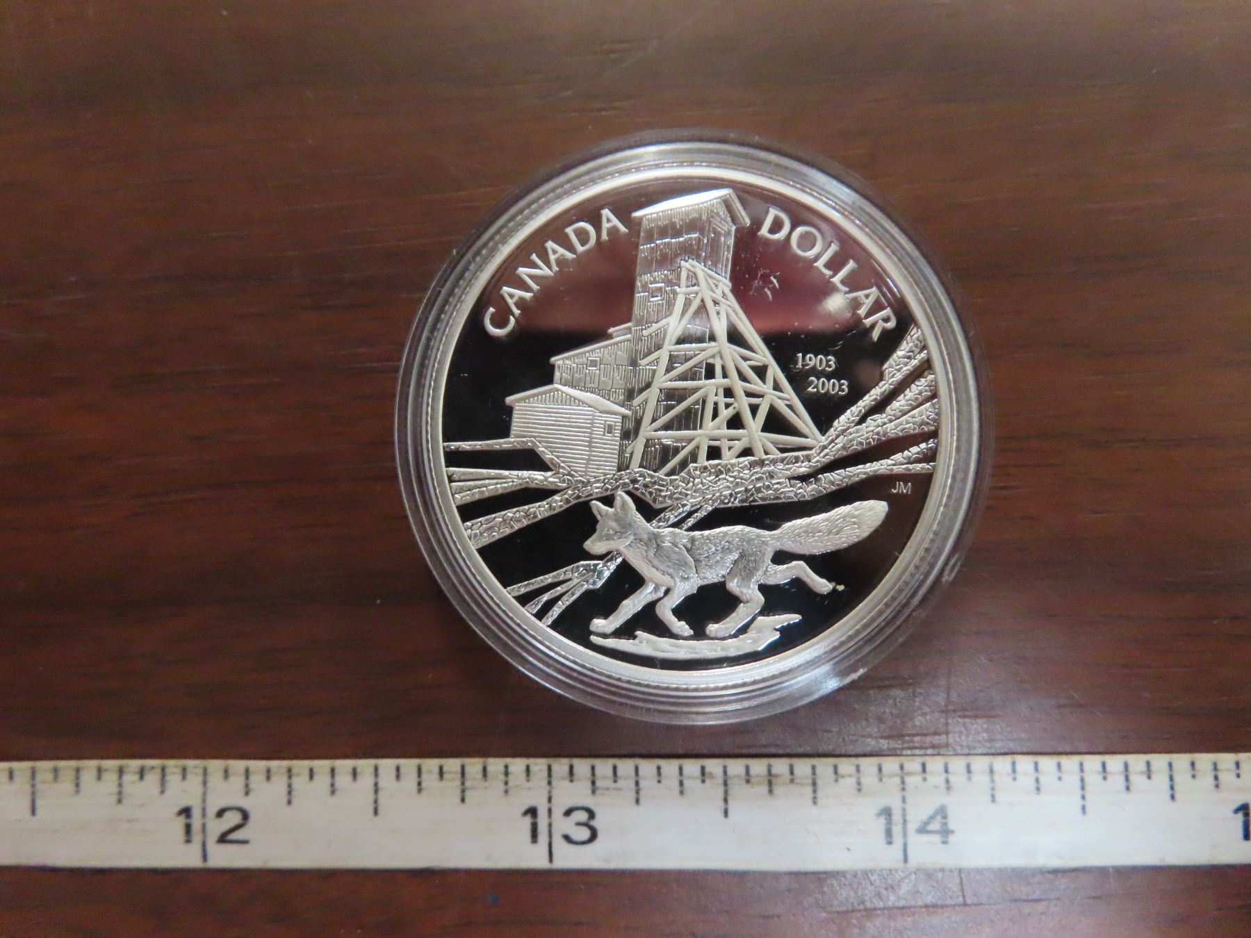 2003 Proof Silver Dollar. Commemorates the 100th Anniversary of a blacksmith throwing a hammer at a fox (missing the fox but hitting a rich vein of silver near Cobalt, Ontario. Proof with Ultra Heavy Cameo. Housed in its original Royal Canadian Mint case of issue. Includes Certificate of Authenticity.