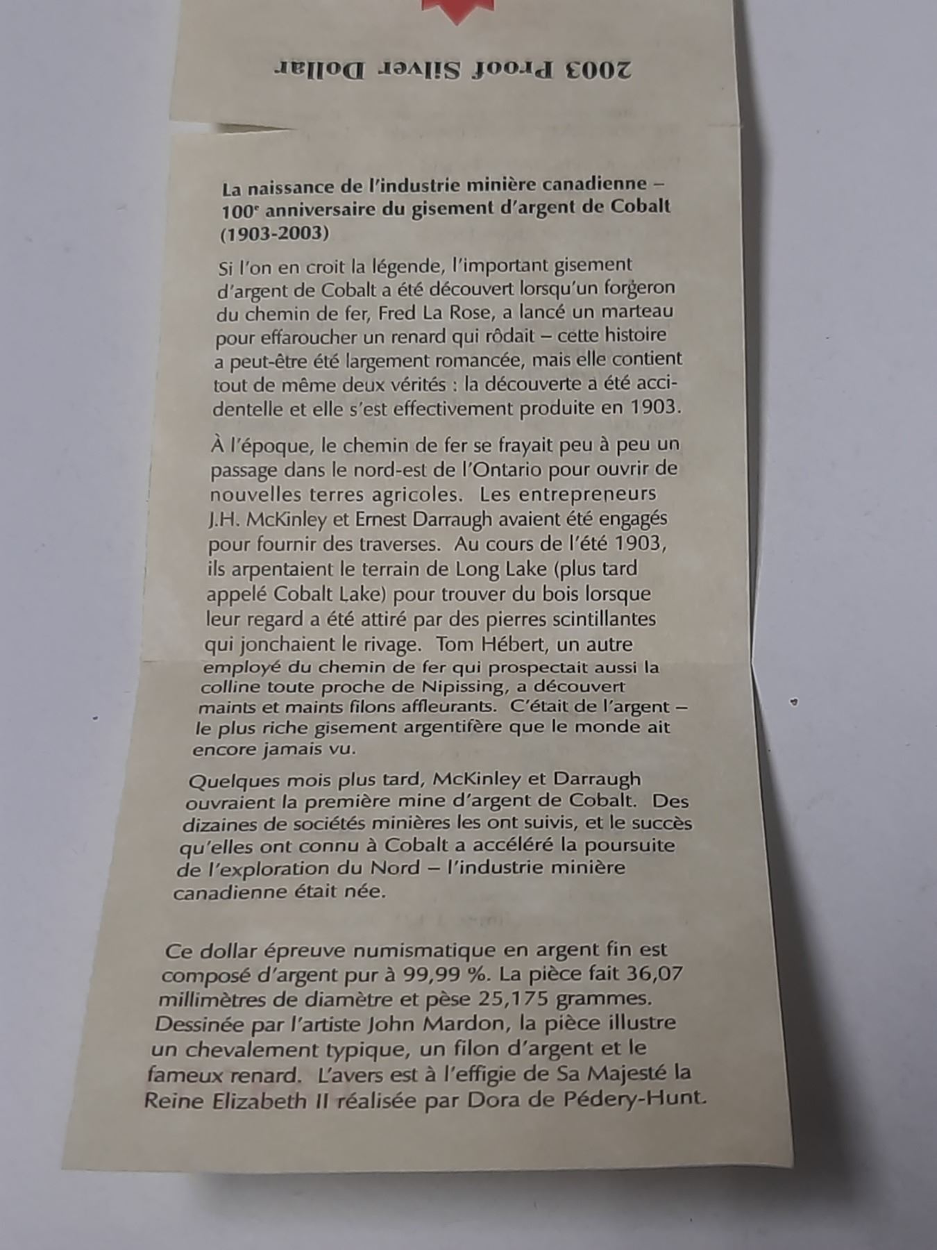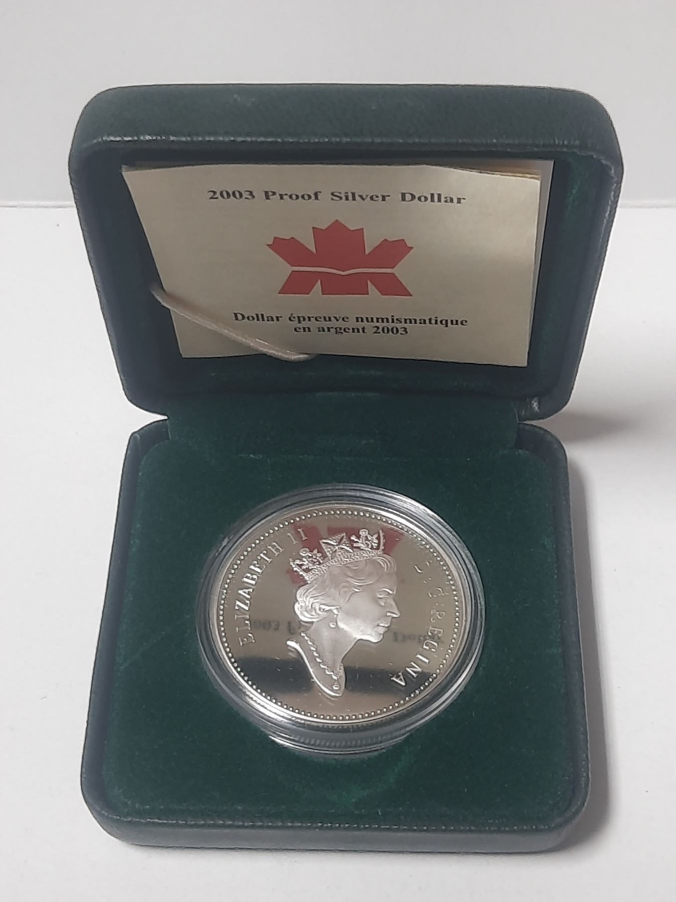 2003 Proof Silver Dollar. Commemorates the 100th Anniversary of a blacksmith throwing a hammer at a fox, missing the fox but hitting a rich vein of Silver at Cobalt, Ontario. 99.99% pure Silver. Includes COA and housed in its original packaging.