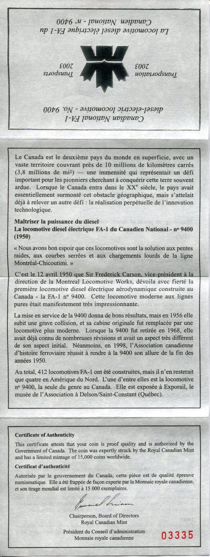 2003 RCM 20 DOLLAR COIN TRANSPORTATION, TRAIN