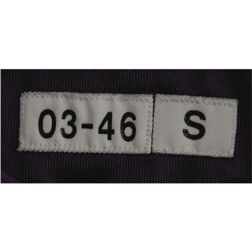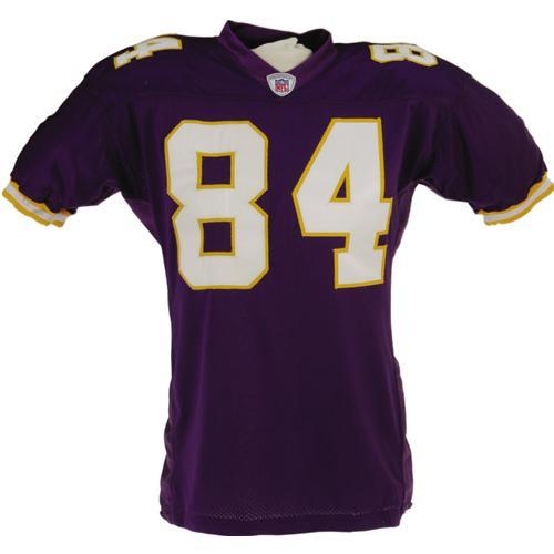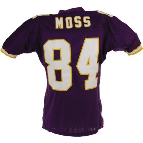 <B>2003 Randy Moss Game Worn Jersey.</B></I> The superstar receiver's finest season to date, with career highs in reception yardage (1,632) and touchdown catches (17). This beautiful purple gamer appears to have served Moss well, with the shoulders exhibiting some solid hit marks, and the tackle twill numerals crinkled with sweat. Number "84" is applied in white and yellow to the chest, back and shoulders, with "Moss" in bold block lettering upon rear nameplate. Chenille team logo patches adorn each sleeve. Collar holds strip tagging that reads, "03-46" and "S," with tail tagging lost to tailoring customization. A jersey worthy of Canton from a player who may find himself there one day. <I>LOA from Lou Lampson.</B></I><BR><BR><b>Shipping:</b> Clothing, Costumes & Jerseys (<a target="_blank" href="http://www.heritageauctions.com/common/shipping.php">view shipping information</a>)