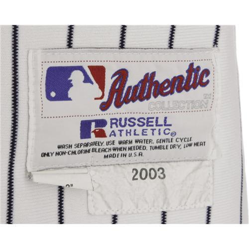 <B>2003 Roger Clemens Game Worn Jersey.</B></I> An historic season for this first-ballot Hall of Famer and seven-time Cy Young Award winner, as the 2003 season saw the Rocket enter the esteemed 300 Win Club, and become one of only three pitchers in the game's history to reach the 4,000 strike out mark. Anyone well-versed in the game worn uniform collecting hobby is aware of the tremendous difficulty involved in acquiring Yankee jerseys dating between 1998 and 2004, when Steinbrenner's management levied tight controls on all team-issued articles, allowing almost nothing to escape to the marketplace. As is typically the case in such a scenario, the occasional low-level player will occasionally be seen, but the appearance of a Roger Clemens jersey from this era is particularly noteworthy. But a jersey worn by this top-tier legend during this most remarkable of seasons makes for a piece that will someday be seen in the same light as a 1936 Hubbell or a 1965 Koufax.<BR><BR> This home white pinstriped New York Yankees jersey shows fine wear from time on the Bronx mound with perhaps the greatest pitcher in the game's history. Classic "NY" logo appears over the heart, with Clemens' number "22" in identical navy tackle twill on verso. The Yankee Centennial patch properly finds a home on the left sleeve. The tail tagging demonstrates strong wear from washings and body sweat, with the "Russell Athletic Authentic Collection" label affixed with flap tags reading "52 100% Polyester" and "+2" Extra Length." The "2003" year tag is sewn to the right. Noteworthy is the absence of the "Russell" sleeve logo, which is proper for Yankee gamers from this era, and an automatic tip-off of a problem if it does appear. A strong example of a Clemens Yankees gamer, earning the highest possible grade for a gamer without verifiable provenance, A5. <I>LOA from Dave Bushing. LOA from Lou Lampson.</B></I><BR><BR><b>Shipping:</b> Clothing, Costumes & Jerseys (<a target="_blank" href="http://www.heritageauctions.com/common/shipping.php">view shipping information</a>)