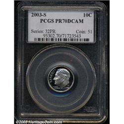 <TABLE cellSpacing=0 cellPadding=0 width="100%" bgColor=#000000 border=0><TBODY><TR><TD width="100%"><TABLE cellSpacing=1 cellPadding=3 width="100%" border=0><TBODY><TR><TD width="100%" bgColor=#79735c><FONT face=arial color=#ffffff size=3><B>Description</B> </FONT></TD></TR><TR><TD width="100%" bgColor=#ffffff><FONT face=arial size=2><B>2003-S 10C Clad PR70 Deep Cameo PCGS.</B></I> Brightly mirrored and as struck. </FONT></TD></TR></TBODY></TABLE></TD></TR></TBODY></TABLE><BR><A name=PricesRealized></A><TABLE cellSpacing=0 cellPadding=0 width="100%" bgColor=#000000 border=0><TBODY><TR><TD width="100%"><TABLE cellSpacing=1 cellPadding=3 width="100%" border=0><TBODY><TR><TD width="100%" bgColor=#79735c><A name=PR><FONT face=arial color=#ffffff size=3><B>Previous Prices from Heritage Auctions</B> </FONT></A></TD></TR><TR><TD bgColor=#f6f6ed>No Prior Data Recorded </TD></TR><TR><TD bgColor=#ffffff><FONT face=arial size=1 ?>PLEASE NOTE: All prices realized reflect the final hammer price PLUS the buyer's premium in auctions that charge a buyer's premium. Each item has a notation at the top of the listing indicating whether that lot included a buyer's premium. Example: A item that sells with a final hammer price of $100 and a 20% buyer's premium will display with a price realized of $120. All information listed is intended to be as accurate as possible, but errors are possible. Please use this guide carefully and inform us of any inaccuracies. </FONT></TD></TR></TBODY></TABLE></TD></TR></TBODY></TABLE><BR><TABLE cellSpacing=0 cellPadding=0 width="100%" bgColor=#000000 border=0><TBODY><TR><TD width="100%"><TABLE cellSpacing=1 cellPadding=3 width="100%" border=0><TBODY><TR><TD width="100%" bgColor=#79735c colSpan=6><FONT face=arial color=#ffffff size=3><B>Price Guide*</B> </FONT></TD></TR><TR bgColor=#f6f6ed><TD align=middle><B>Grade</B> </TD><TD align=middle><B>Coin World<BR>(Trends)</B> </TD><TD align=middle><B>Numismedia<BR>Retail</B> </TD><TD align=middle><B>Numismedia<BR>Wholesale</B> </TD><TD align=middle><B>Coin<BR>Universe</B> </TD><TD align=middle><B>Heritage<BR>Value Index</B> </TD></TR><TR bgColor=#ffffff><TD align=middle>69</TD><TD align=right>---</TD><TD align=right>---</TD><TD align=right>---</TD><TD align=right>---</TD><TD align=right>---</TD></TR><TR style="FONT-WEIGHT: bold" bgColor=#cccfdd><TD align=middle>70</TD><TD align=right>---</TD><TD align=right>---</TD><TD align=right>---</TD><TD align=right>---</TD><TD align=right>---</TD></TR><TR bgColor=#ffffff><TD colSpan=6><FONT size=1>*All information listed is intended to be as accurate as possible, but errors are possible. No item may be returned or refused based on this information which is provided as a service to our customers. You should contact each pricing source directly to determine the accuracy of this information. </FONT></TD></TR></TBODY></TABLE></TD></TR></TBODY></TABLE><BR><TABLE cellSpacing=0 cellPadding=0 width="100%" bgColor=#000000 border=0><TBODY><TR><TD width="100%"><TABLE cellSpacing=1 cellPadding=3 width="100%" border=0><TBODY><TR><TD width="100%" bgColor=#79735c><FONT face=arial color=#ffffff size=3><B>Population Guide</B> </FONT></TD></TR><TR bgColor=#ffffff><TD align=middle><!-- Begin Output of Population Grid--><TABLE cellSpacing=0 cellPadding=0 width="100%" border=0><TBODY><TR><TD vAlign=center><TABLE cellSpacing=0 width="100%" border=1 cellsadding="3"><TBODY><TR><TD vAlign=center><TABLE cellSpacing=0 cellPadding=3 width="100%" border=1><TBODY><TR><TD vAlign=center align=middle bgColor=#f0f1e8 colSpan=2 <CENTER><FONT face=Arial size=2><B>PCGS Pop </B></FONT><CENTER></CENTER></TD><TD vAlign=center align=middle bgColor=#f0f1e8 colSpan=2><CENTER><FONT face=Arial size=2><B>NGC Pop</B></CENTER></FONT></TD></TR><TR><TD vAlign=center><FONT face=Arial size=2>(70)</FONT> </TD><TD vAlign=center align=right><FONT face=Arial size=2>0</FONT> </TD><TD vAlign=center><FONT face=Arial size=2>(70)</FONT> </TD><TD vAlign=center align=right><FONT face=Arial size=2>0</FONT> </TD></TR><TR><TD vAlign=center><FONT face=Arial size=2>(>70)</FONT> </TD><TD vAlign=center align=right><FONT face=Arial size=2>0</FONT> </TD><TD vAlign=center><FONT face=Arial size=2>(>70)</FONT> </TD><TD vAlign=center align=right><FONT face=Arial size=2>0</FONT> </TD></TR></TBODY></TABLE></TD></TR></TBODY></TABLE></TD></TR></TBODY></TABLE><!-- End Output of Population Grid--> Important notice: Heritage usually auctions material at the rate of 200-250 lots per hour. On some occasions eBay Live bid software or the Internet may not be able to keep up with the pace of the auction. We recommend placing a realistic absentee bid now as insurance to avoid disappointment. Occasionally the auctioneer may eliminate or reject an eBay Live bid, and the auctioneer may also reopen a lot after the close of the eBay live bidding (usually because we missed an audience bid), and may reject your bid even if it shows you as the winning bidder. By bidding via eBay Live, you agree that Heritage may award the lot to another bidder at its sole discretion under the circumstances described above or any other reasonable circumstances. Also please note that all Heritage lots purchased through eBay Live carry a 20% Buyer's Premium. Please make sure you read the Terms and Conditions before you bid.</TD></TR></TBODY></TABLE></TD></TR></TBODY></TABLE>