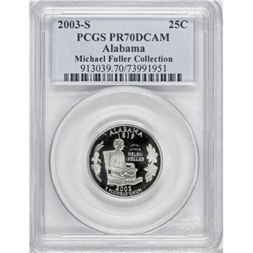 <B>2003-S 25C Alabama Clad PR70 Deep Cameo PCGS.</B></I> Michael Fuller Collection. PCGS Population (102/0). NGC Census: (0/0). Numismedia Wsl. Price for NGC/PCGS coin in PR70: $120. (#913039)<BR><BR><b>Shipping:</b> Coins & Currency (<a target="_blank" href="http://www.heritageauctions.com/common/shipping.php">view shipping information</a>)