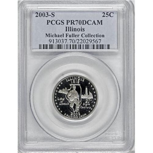 <B>2003-S 25C Illinois Clad PR70 Deep Cameo PCGS.</B></I> Michael Fuller Collection. PCGS Population (101/0). NGC Census: (0/0). Numismedia Wsl. Price for NGC/PCGS coin in PR70: $100. (#913037)<BR><BR><b>Shipping:</b> Coins & Currency (<a target="_blank" href="http://www.heritageauctions.com/common/shipping.php">view shipping information</a>)